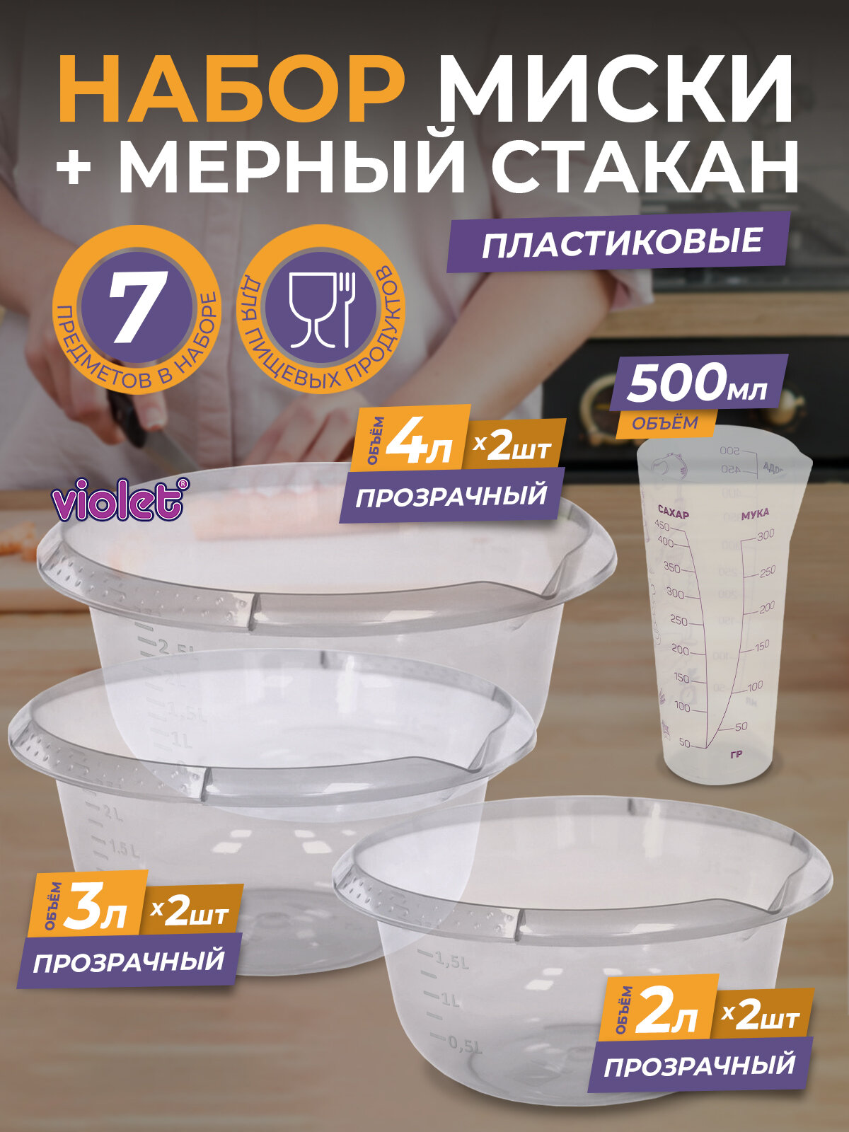 Купить Набор из 7 предметов: Миски с мерным делением 2л - 2шт, 3л - 2шт, 4л - 2шт, цвет прозрачный, стакан Поварёнок 0,5л