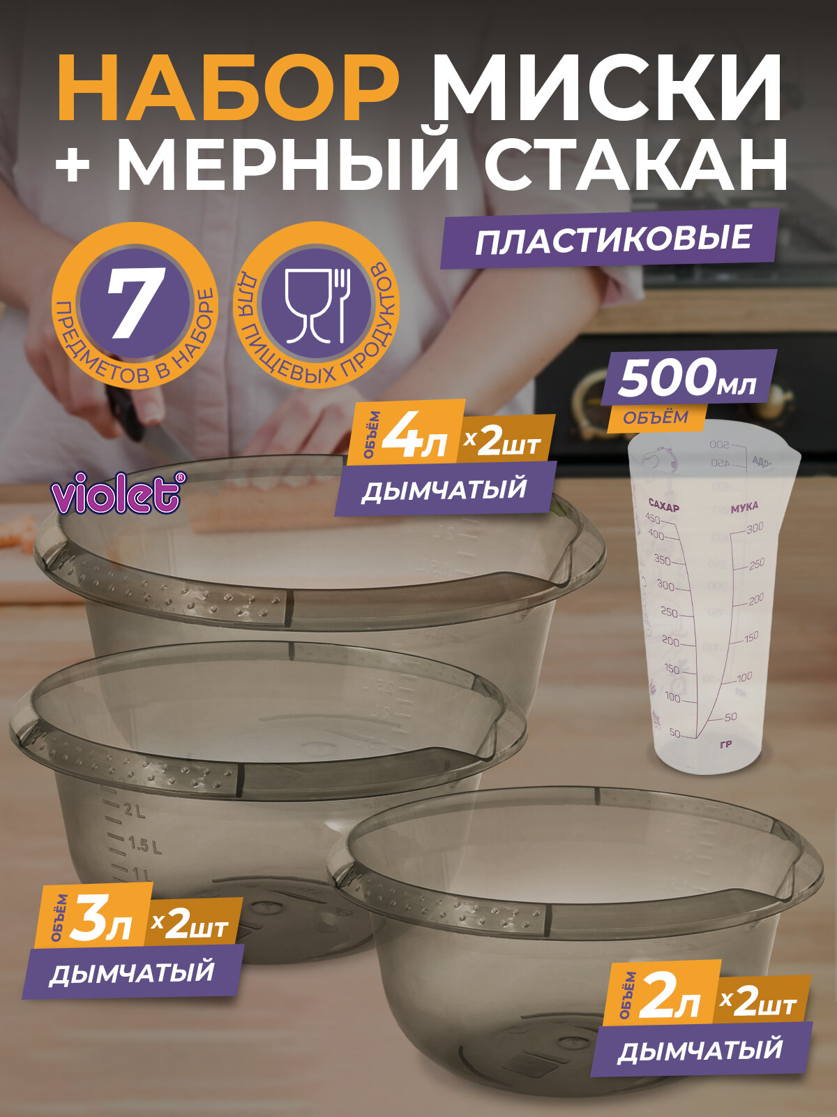 Купить Набор из 7 предметов: Миски с мерным делением 2л - 2шт, 3л - 2шт, 4л - 2шт, цвет дымчатый, мерный стакан Поварёнок 0,5л
