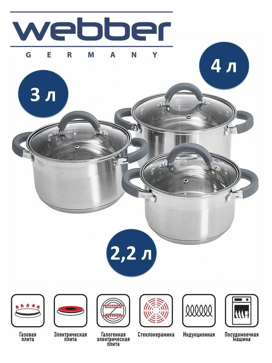Купить Набор кастрюль Webber BE-625/6 из нержавеющей стали со стеклянными крышками, 6 предметов
