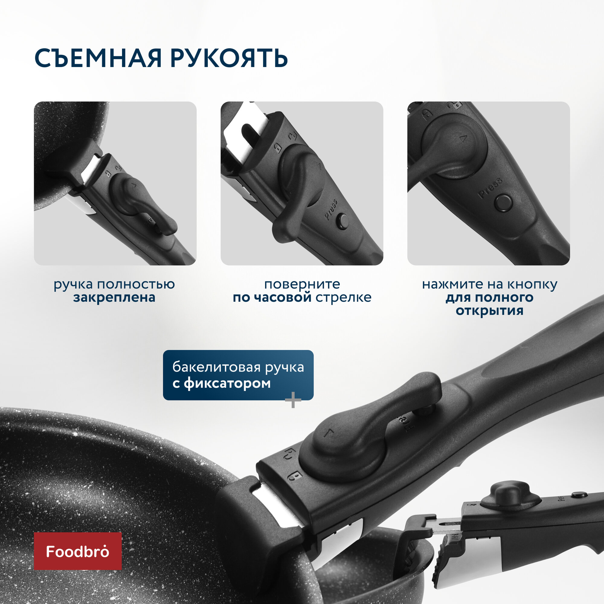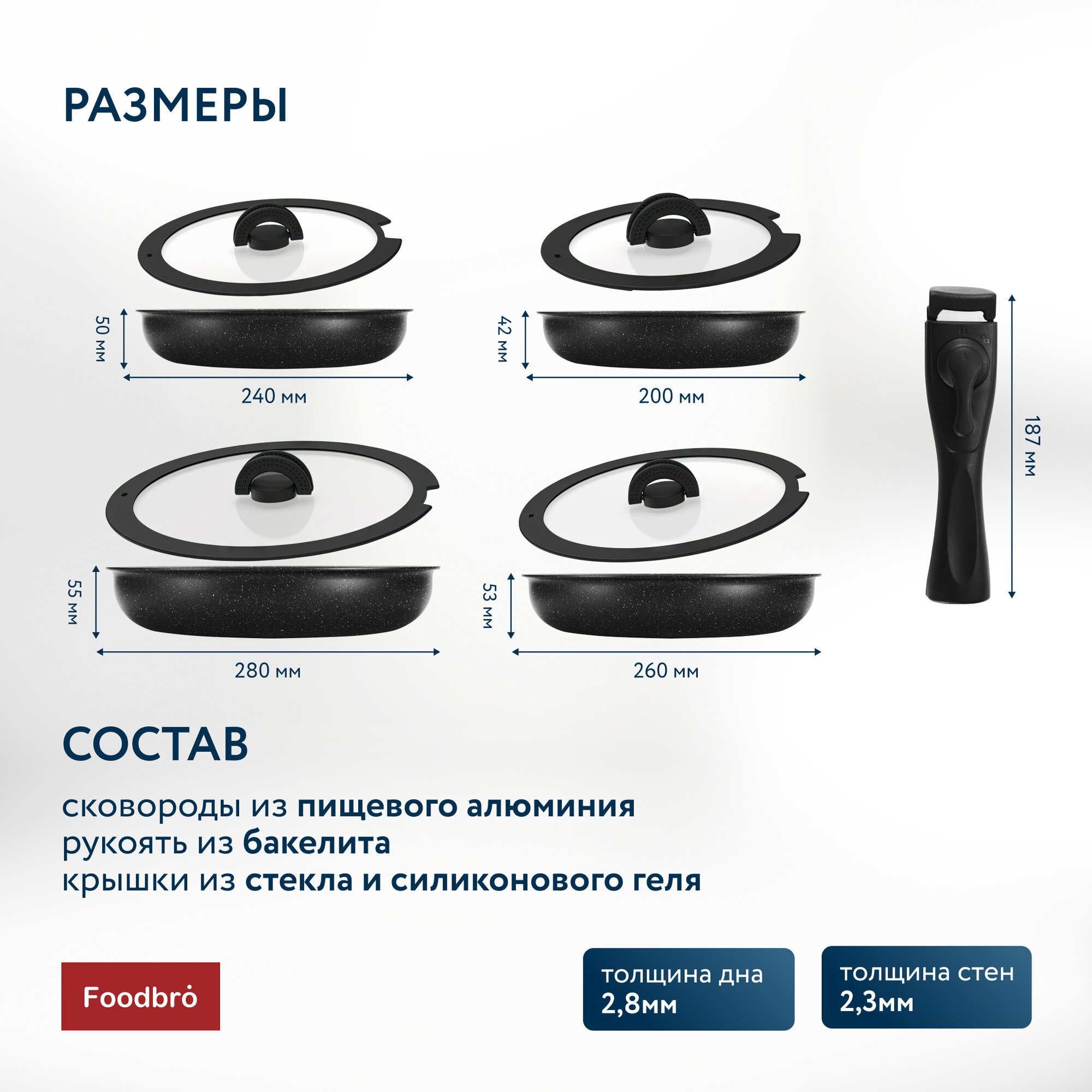 Набор сковород с крышками Foodbro черные со съемной ручкой 4 шт. интересное: