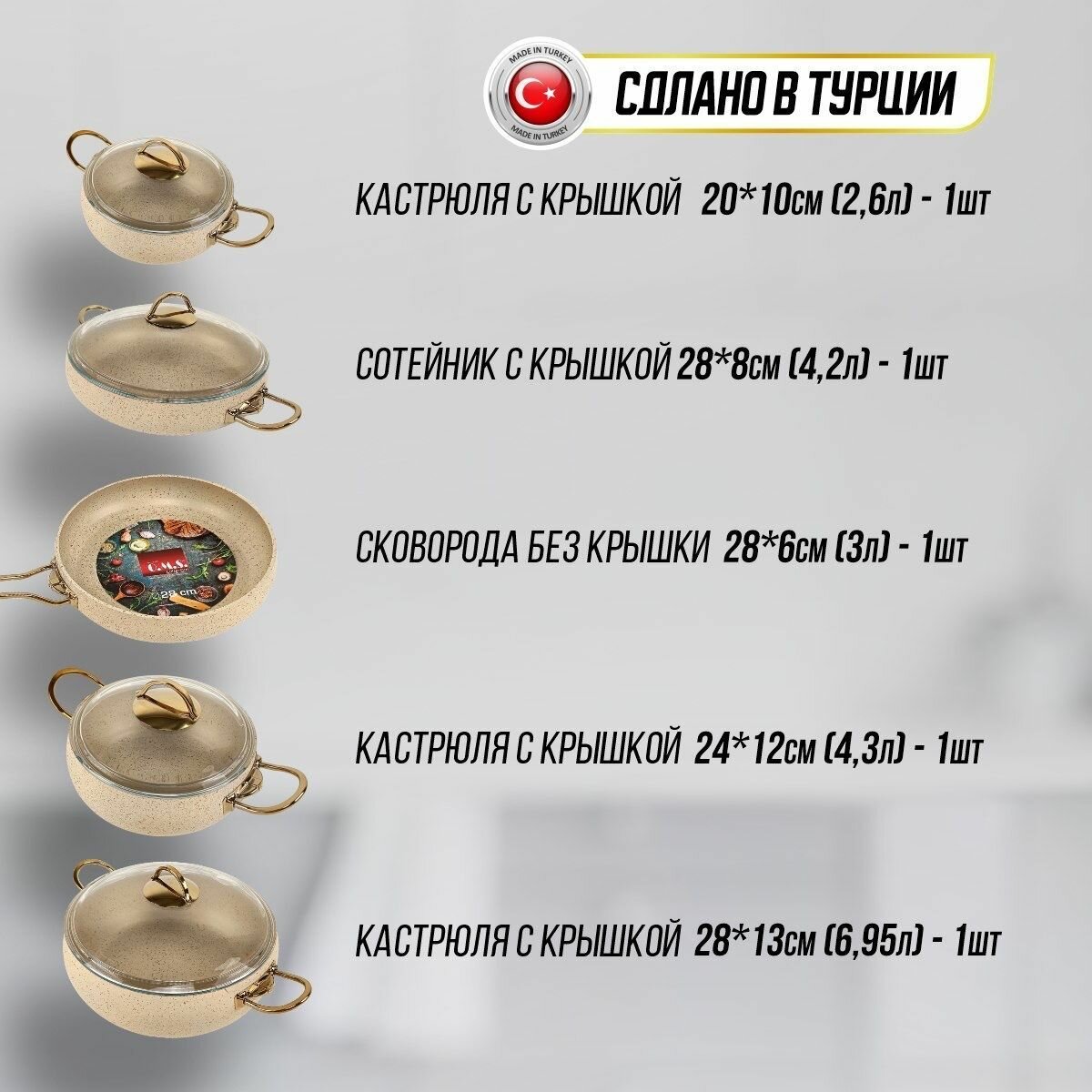 Набор посуды для приготовления OMS, 3037-Gd, бежевые золотые штрихи, с антипригарным покрытием, с крышками, 9 предметов
