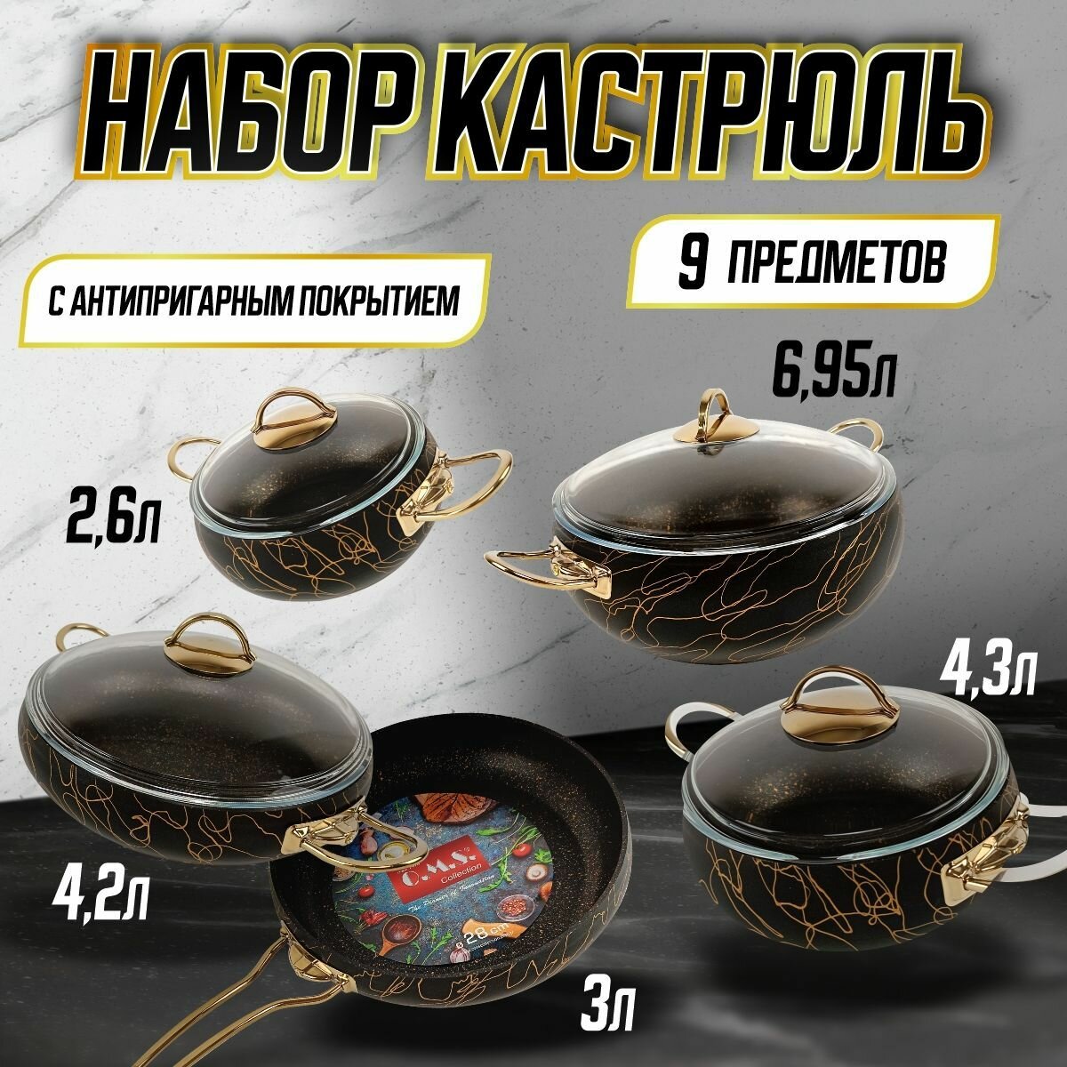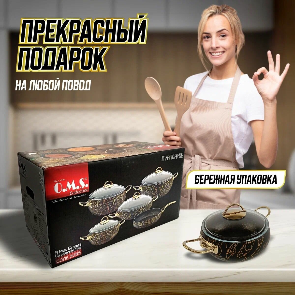 Купить Набор посуды для приготовления OMS, 3037-Gd, черные золотые штрихи, с антипригарным покрытием, с крышками, 9 предметов