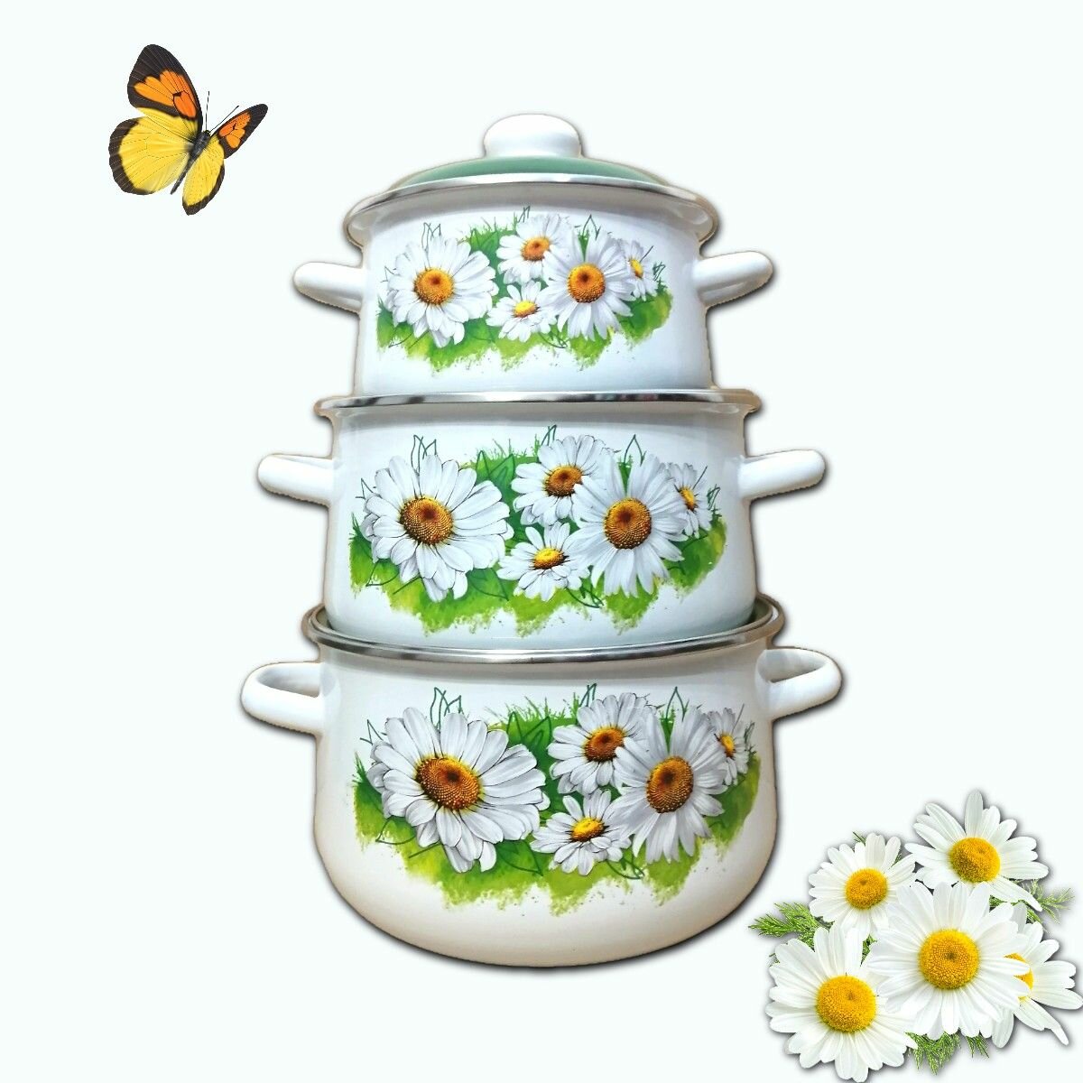 Набор эмалированных кастрюль Ромашки лето 1С408, 2л, 4л, 5,5л интересное:
