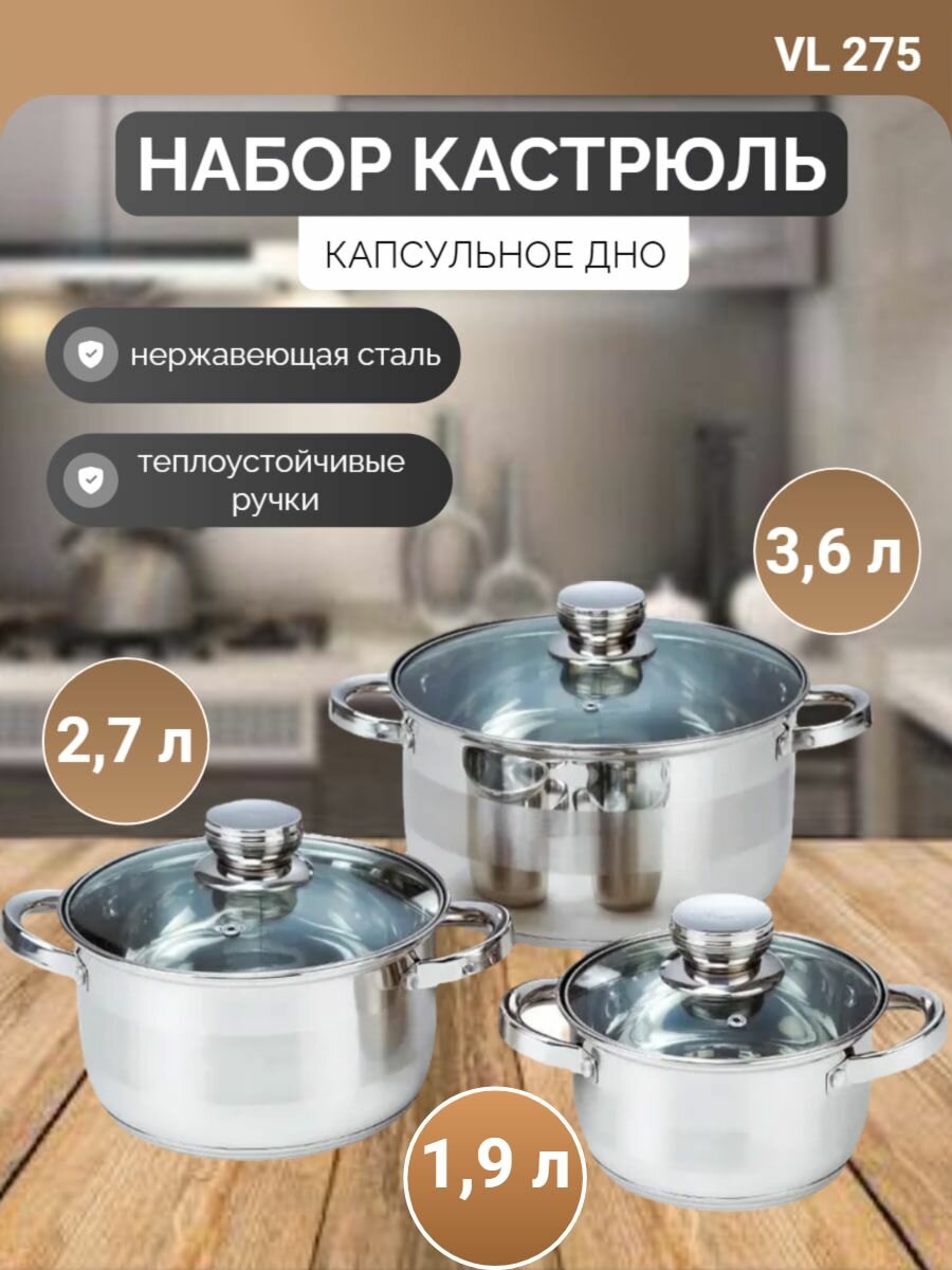 Набор кастрюль (1.9л./ 2.7 л./ 3.6л.) VICALINA VL-275 - 6 предметов - из Нержавеющей стали интересное: