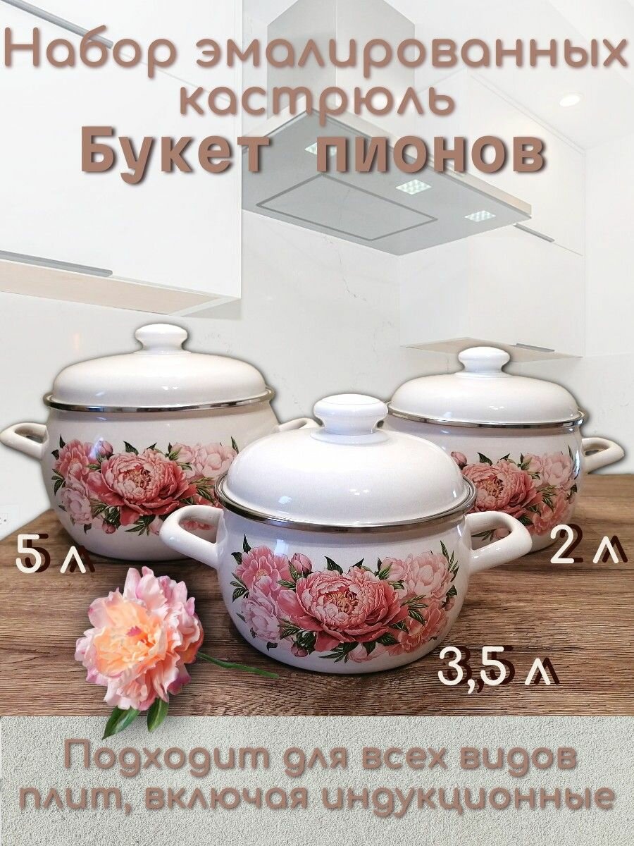 Набор эмалированных кастрюль Букет Пионов 2/3,5/5 л интересное: