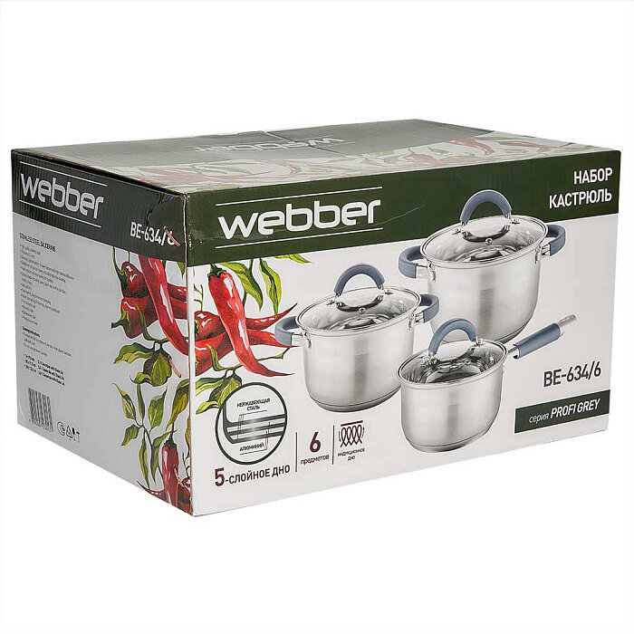 Набор посуды Webber BE-631/6 Classic, 6 предметов, для всех типов плит, нержавеющая сталь, серебристый