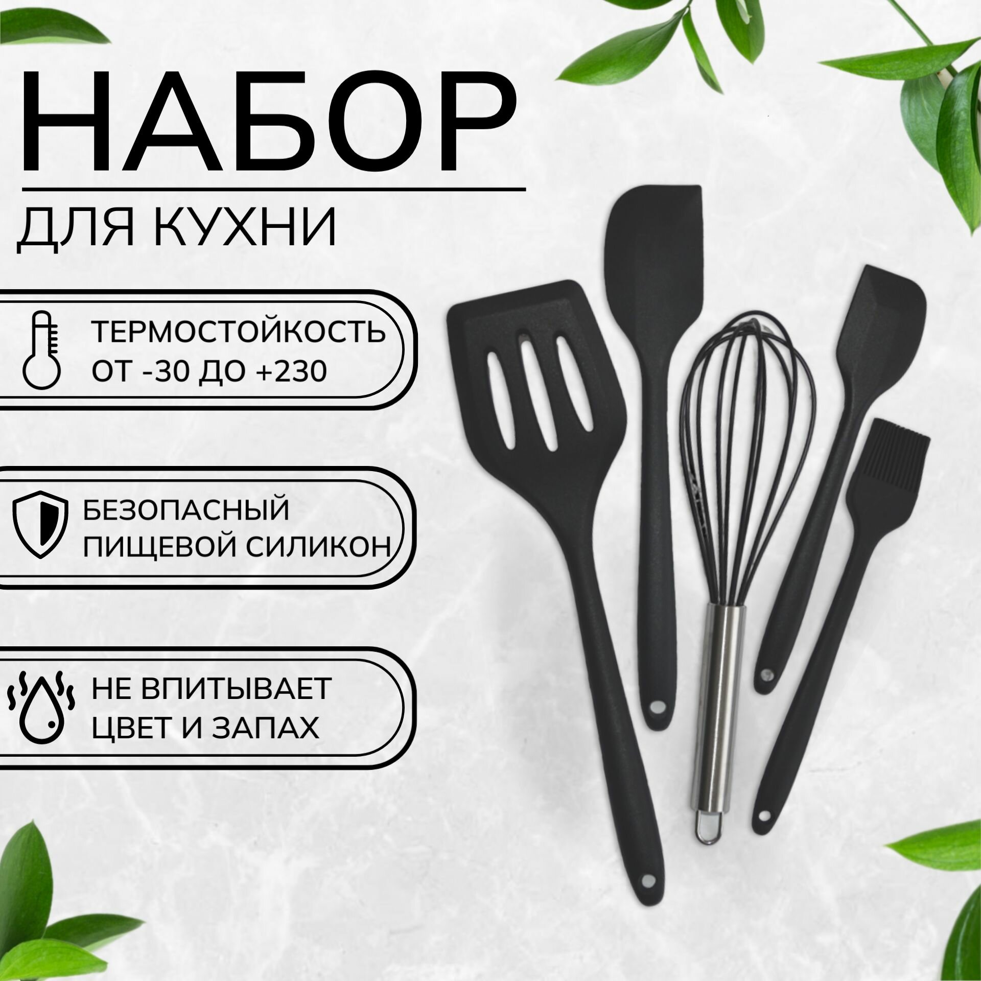 Купить Набор кухонных принадлежностей для готовки силиконовый, 5 предметов, черный