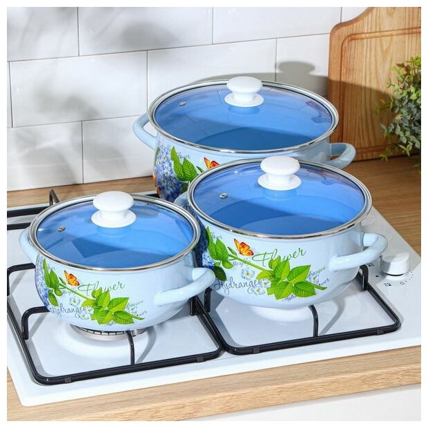 Купить Набор эмалированных кастрюль "Гортензия", 3 предмета: 2 л, 3 л, 4 л, индукция