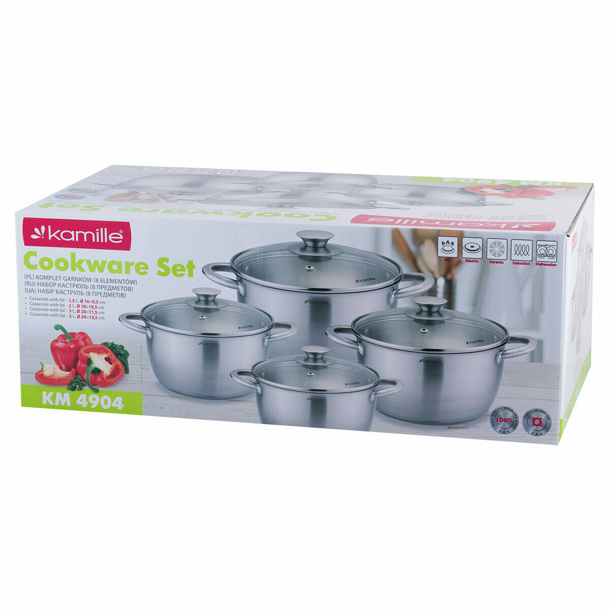 Ниже Вы можете прочитать отзывы на Набор кастрюль 8 предметов Kamille KM 4904 из нержавеющей стали 1,5 л; 2 л; 3 л; 5 л. (серебристый), ознакомится с подробными характеристиками, посмотреть интересные обзоры и фотографии на Набор кастрюль 8 предметов Kamille KM 4904 из нержавеющей стали 1,5 л; 2 л; 3 л; 5 л. (серебристый).