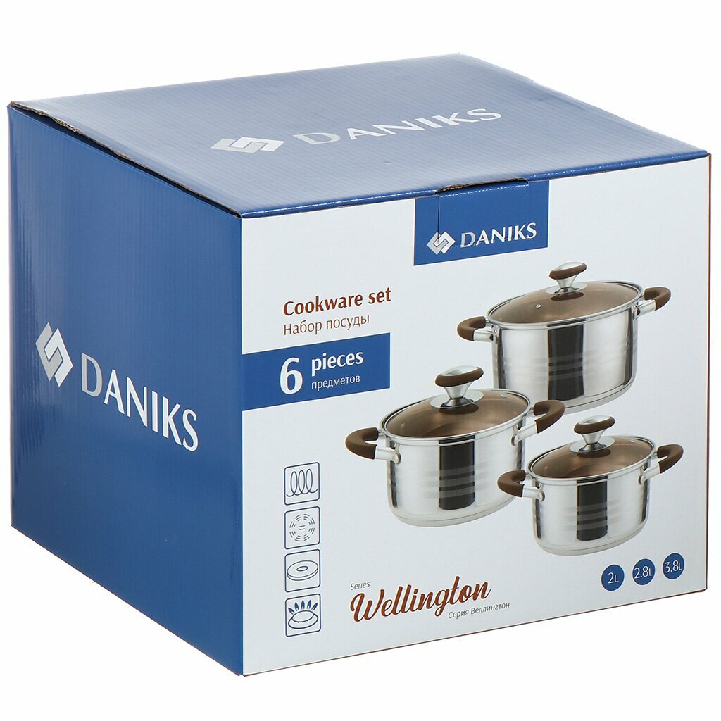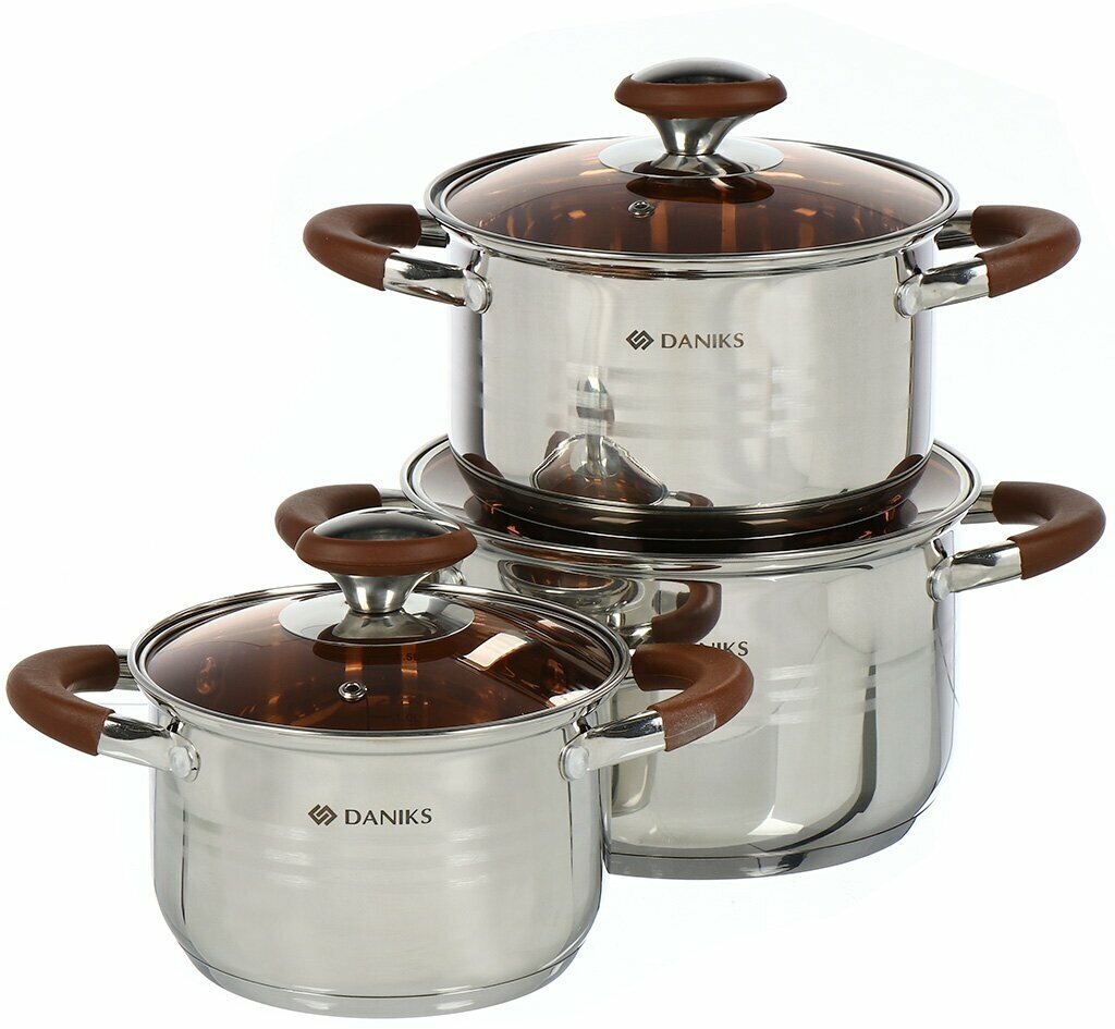 Набор посуды нержавеющая сталь, 6 предметов, кастрюли 1.9,2.9,3.9 л, индукция, Daniks, Классика, SD-6
