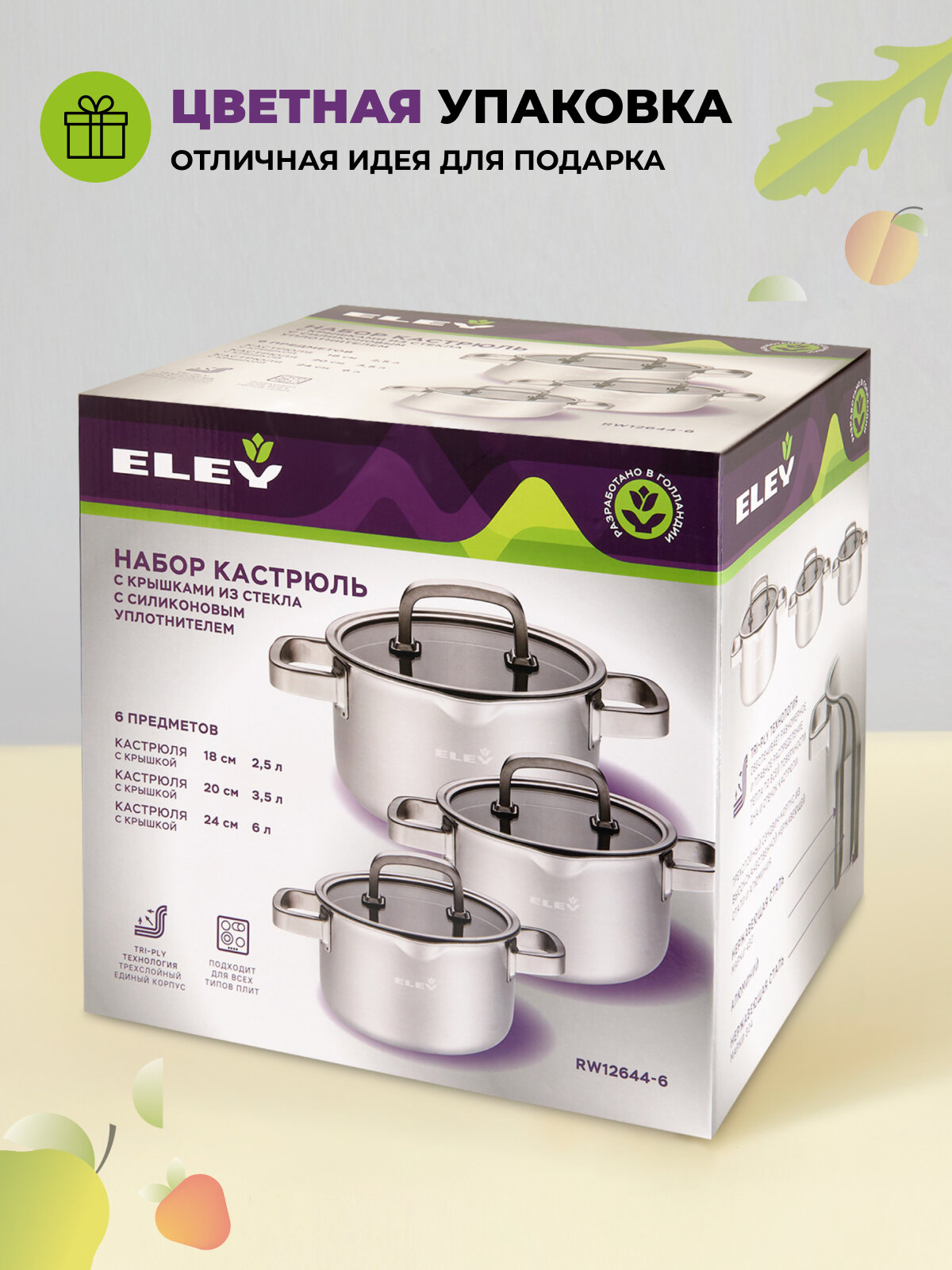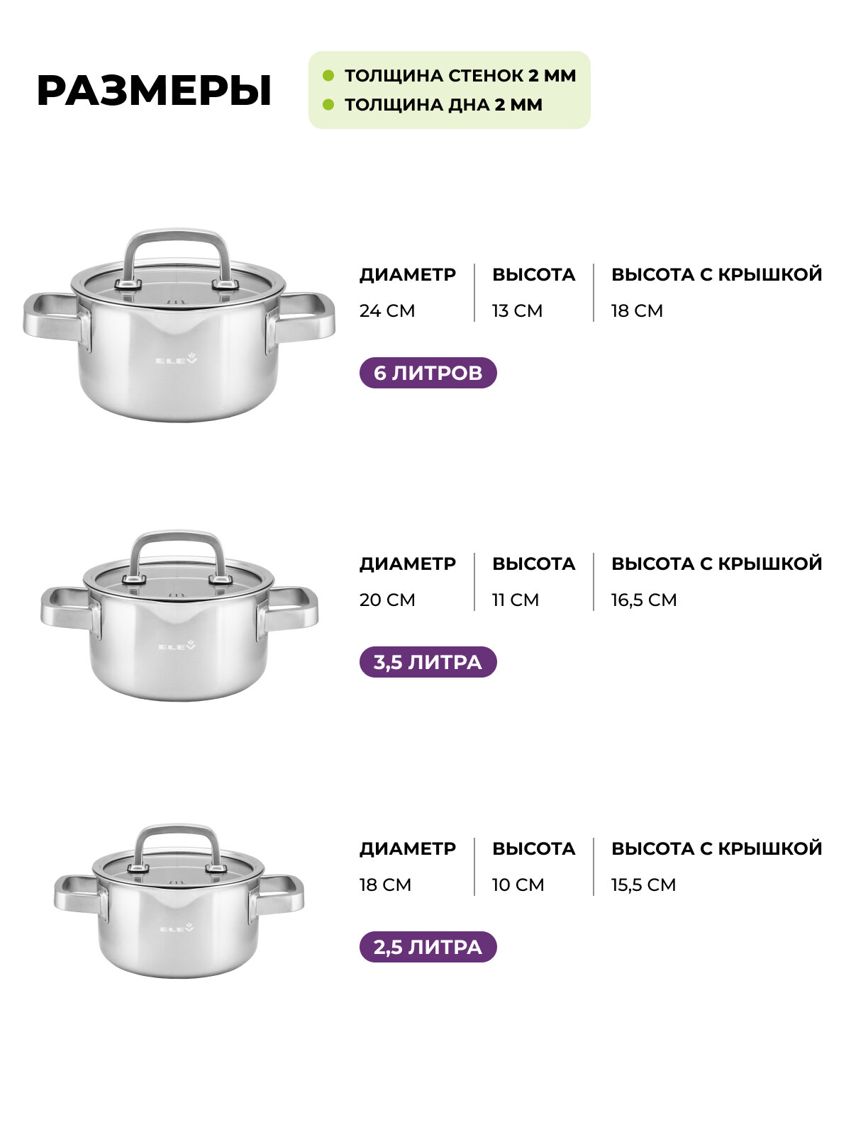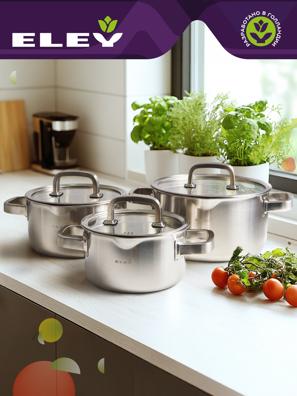 Набор кастрюль 2,5л 3,5л 6л из нержавеющей стали Eley с металлическими ручками интересное: