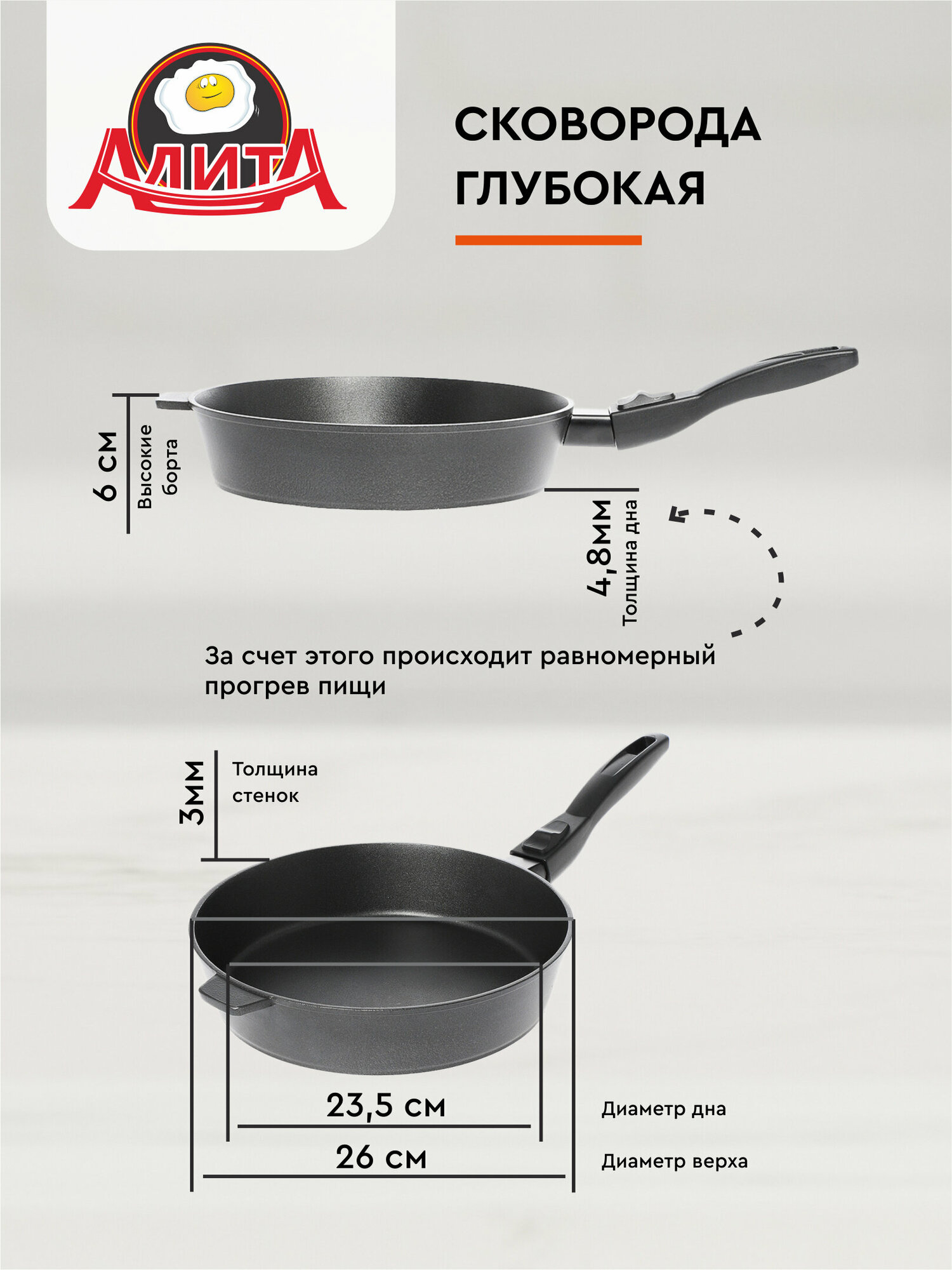 Купить Сковорода антипригарная 26 см со съемной ручкой глубокая литая алюминиевая с покрытием, Антрацит
