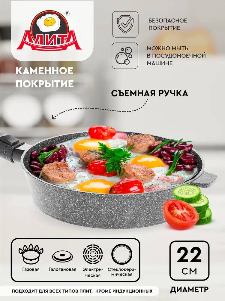 Сковорода Алита Хозяюшка Природный камень с антипригарным покрытием, со съемной ручкой, из алюминия, диаметром 28см