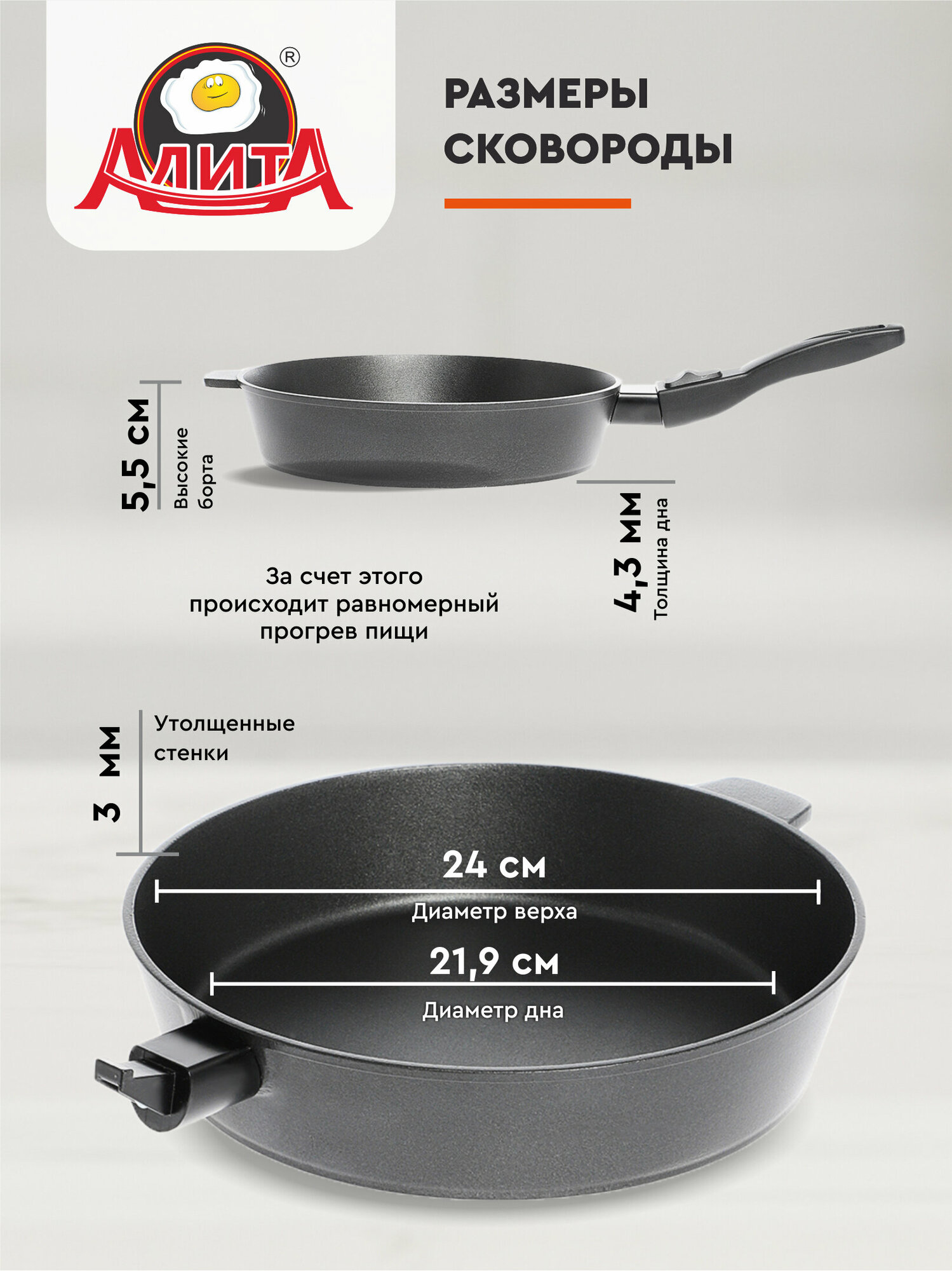 Купить Сковорода антипригарная 24 см со съемной ручкой глубокая литая алюминиевая с покрытием, Антрацит