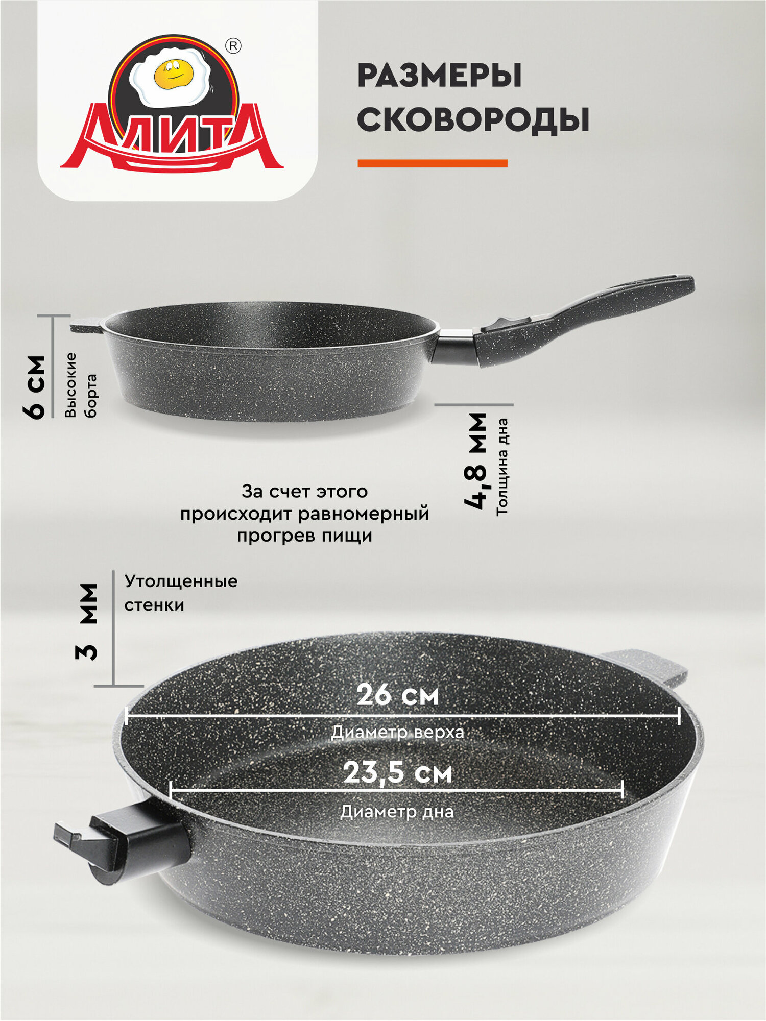 Сковорода антипригарная 26 см со съемной ручкой глубокая литая алюминиевая с покрытием, Антрацит