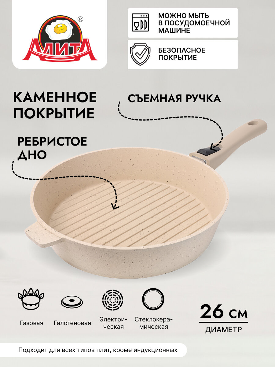 Сковорода гриль 26 см со съемной ручкой антипригарная алюминиевая литая с покрытием, Природный камень