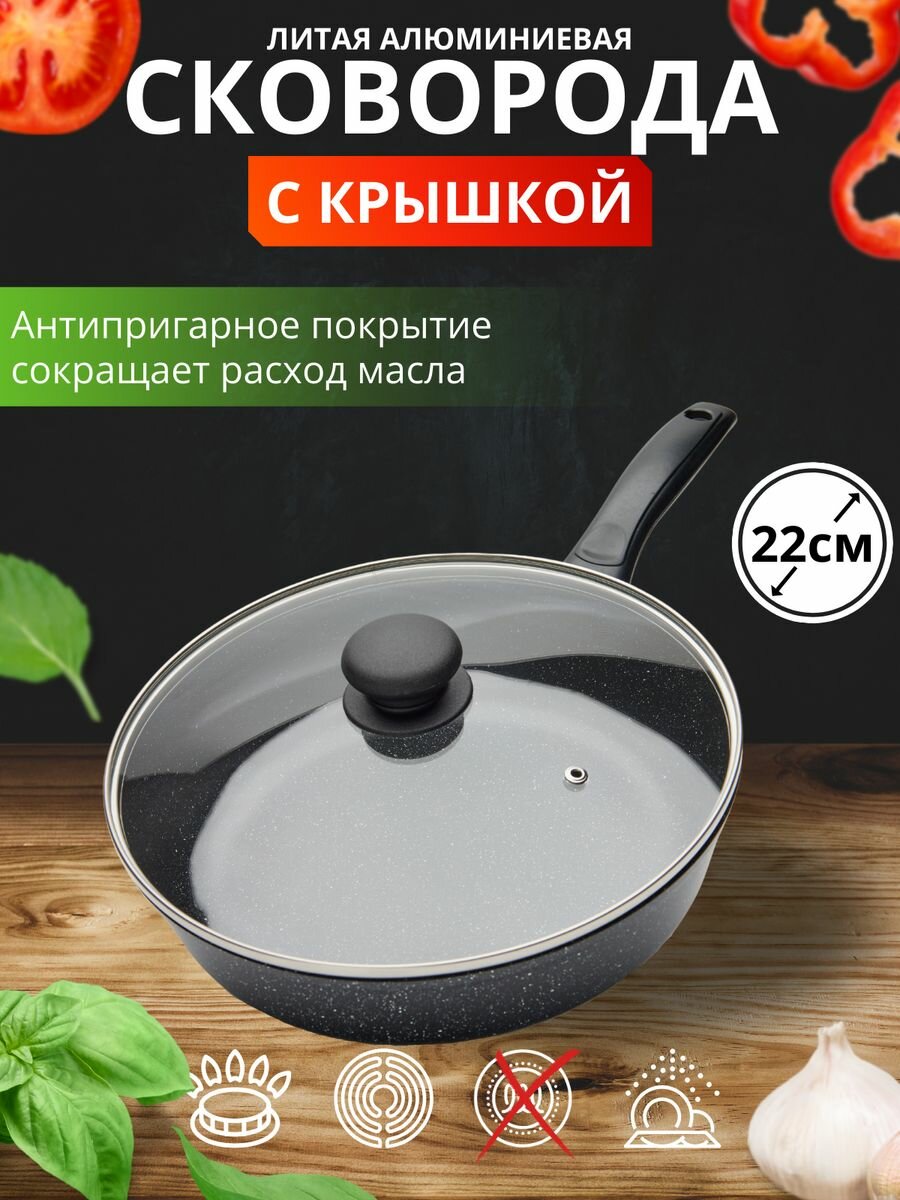 Сковорода 22см "Премьер" серии "Granit Standart" из литого алюминия с антипригарным покрытием, съемной ручкой и стеклянной крышкой, можно мыть в посудомоечной машине интересное: