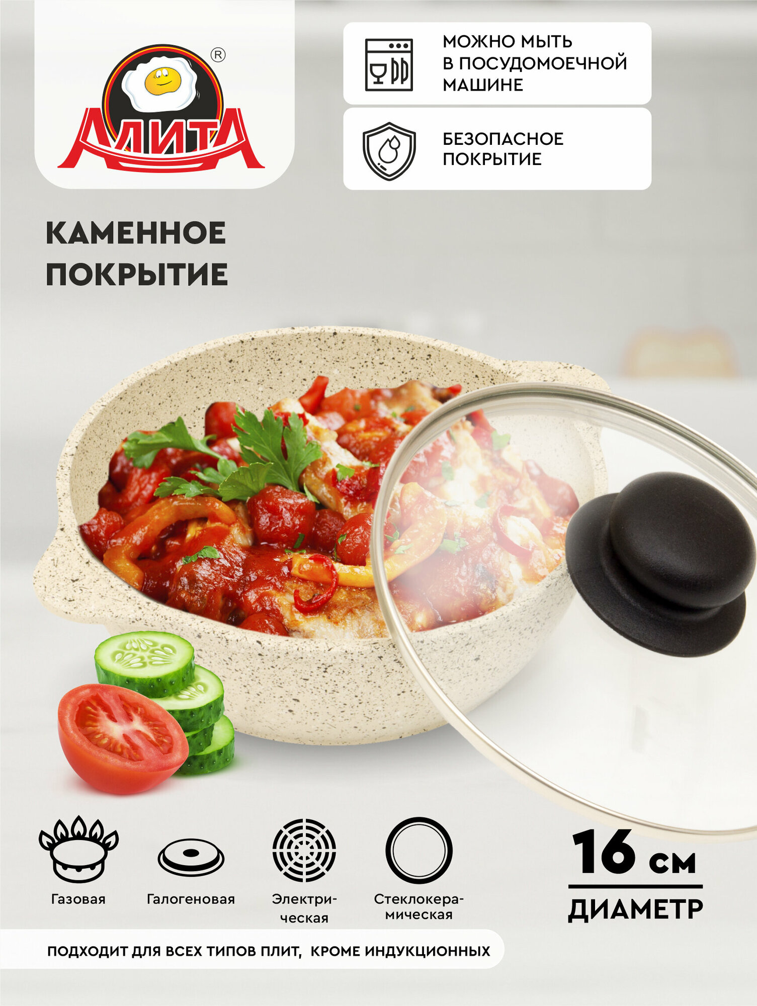 Сковорода с крышкой для яичницы маленькая 16 см антипригарная глубокая литая с покрытием, Природный камень