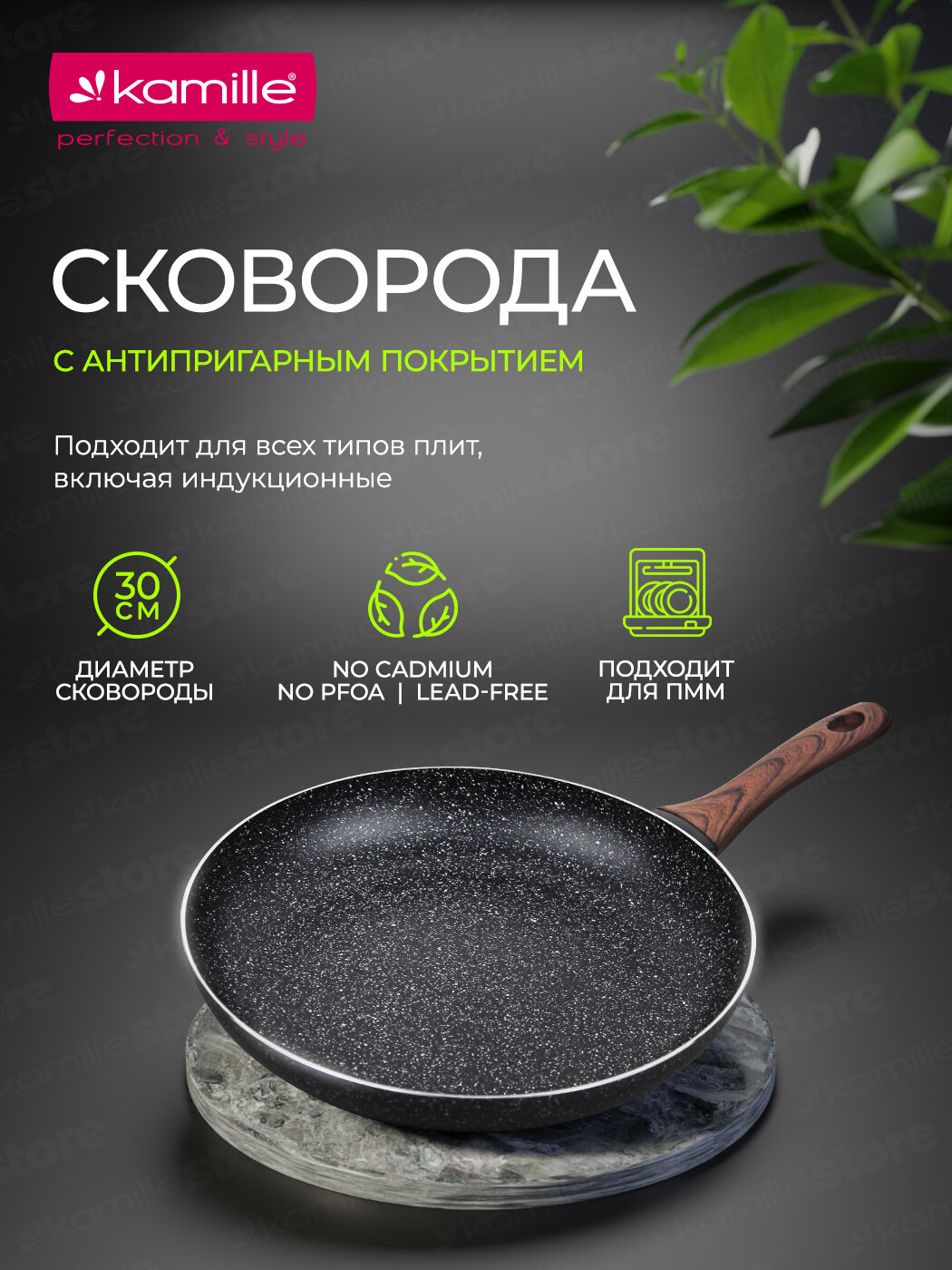 Сковорода 30 см. из алюминия Kamille KM 4115MR с мраморным покрытием (30 см. / черный) интересное: