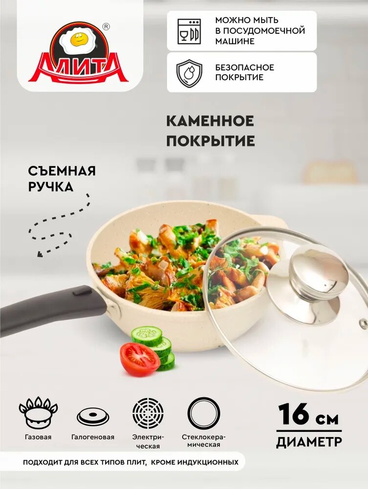 Сковорода с крышкой со съемной ручкой антипригарная маленькая 16 см, Природный камень