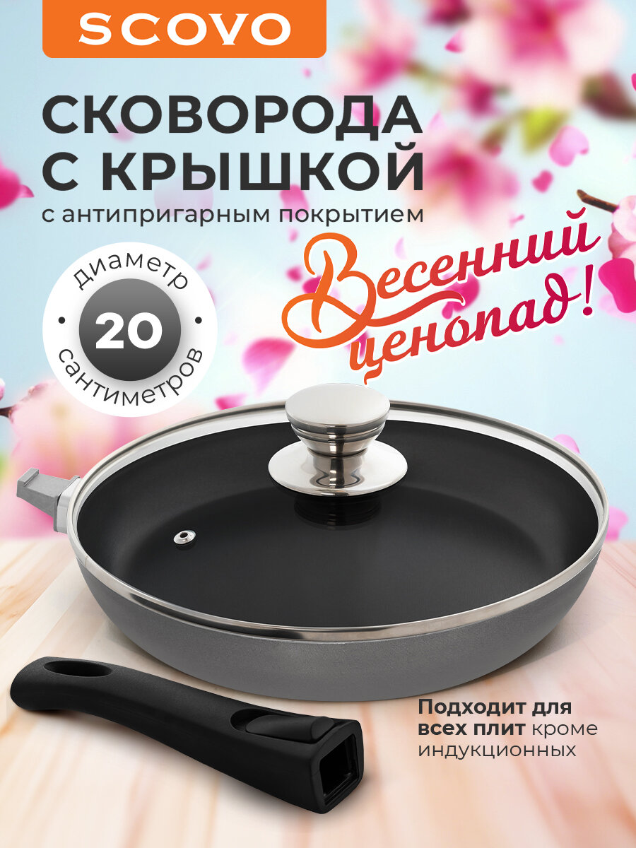 СохранитьСковорода с крышкой с антипригарным покрытием 20 см со съемной ручкой Easy Cook SCOVO интересное: