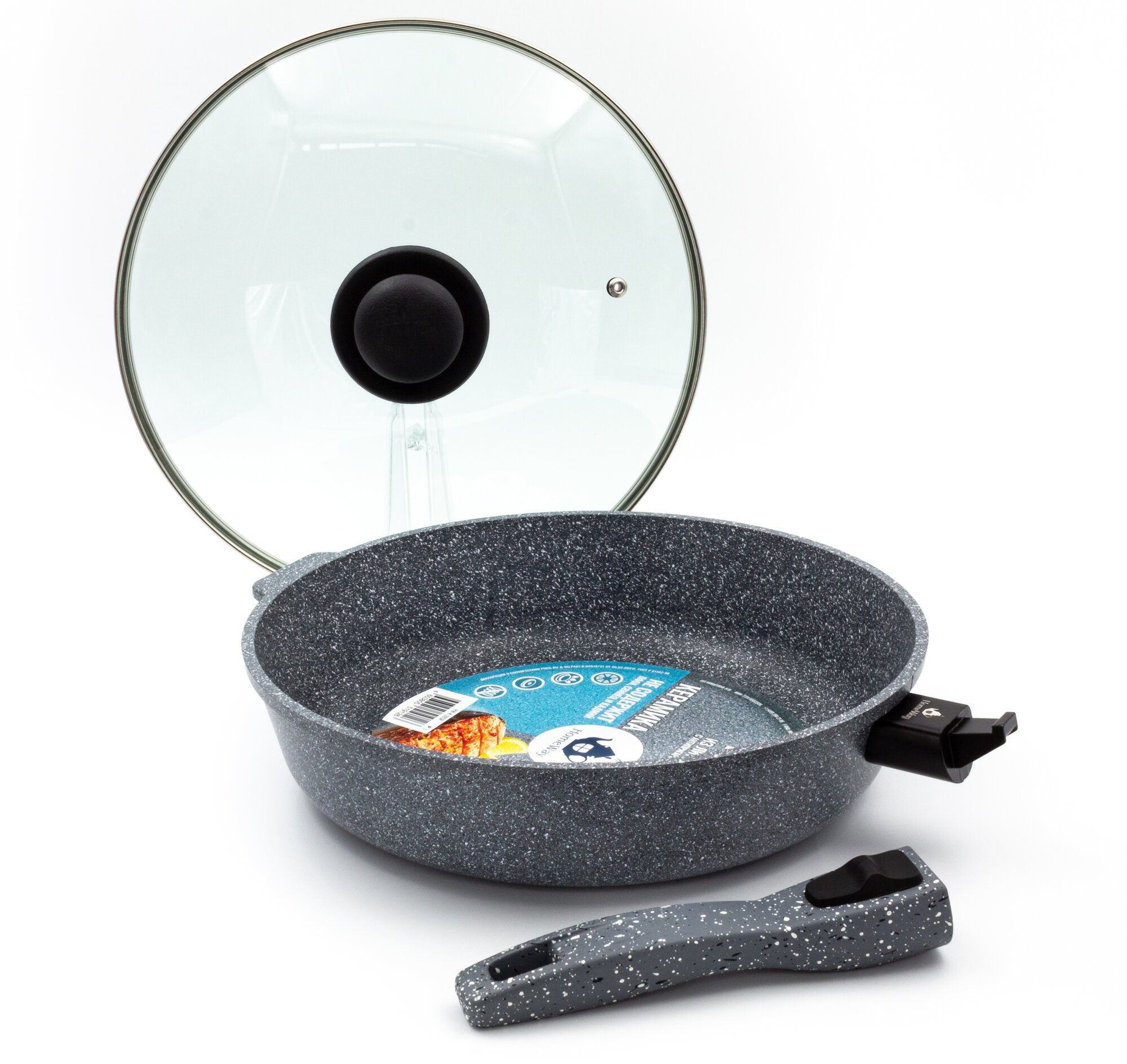 Сковорода литая 24 см, с керамическим покрытием с крышкой и съемной ручкой, HomeWay