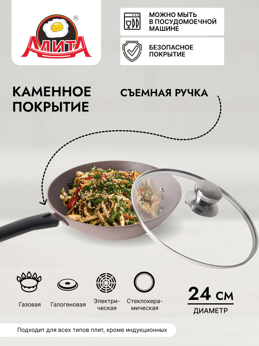 Сковорода вок с крышкой 24 см со съемной ручкой глубокая с толстым дном, Природный камень