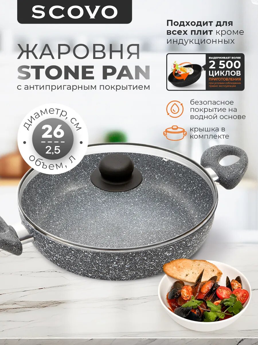 Сковорода с крышкой 2,5л с антипригарным покрытием Stone Pan Scovo интересное: