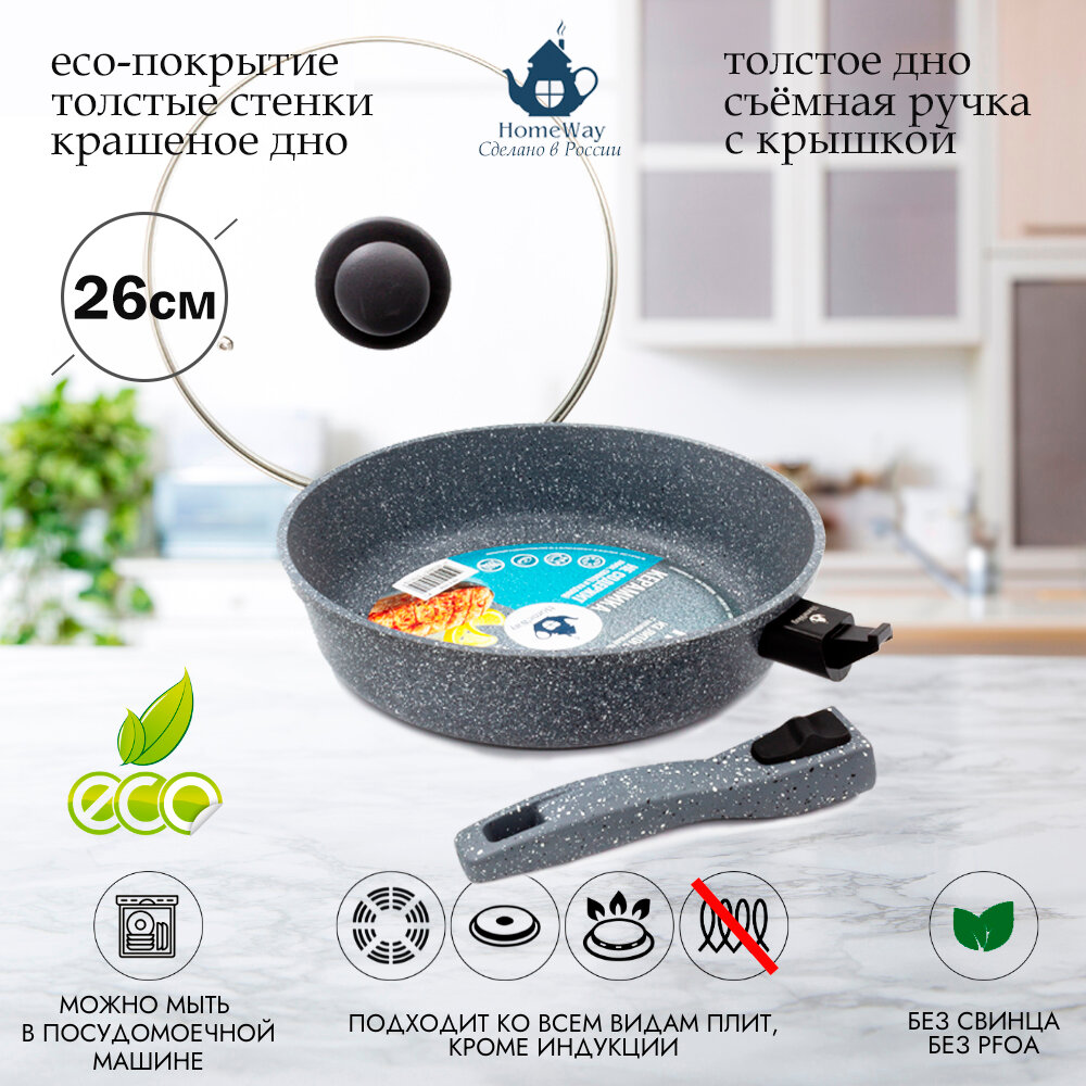 СохранитьСковорода литая серии керамика с крышкой и съемной ручкой, 26 см, HomeWay интересное: