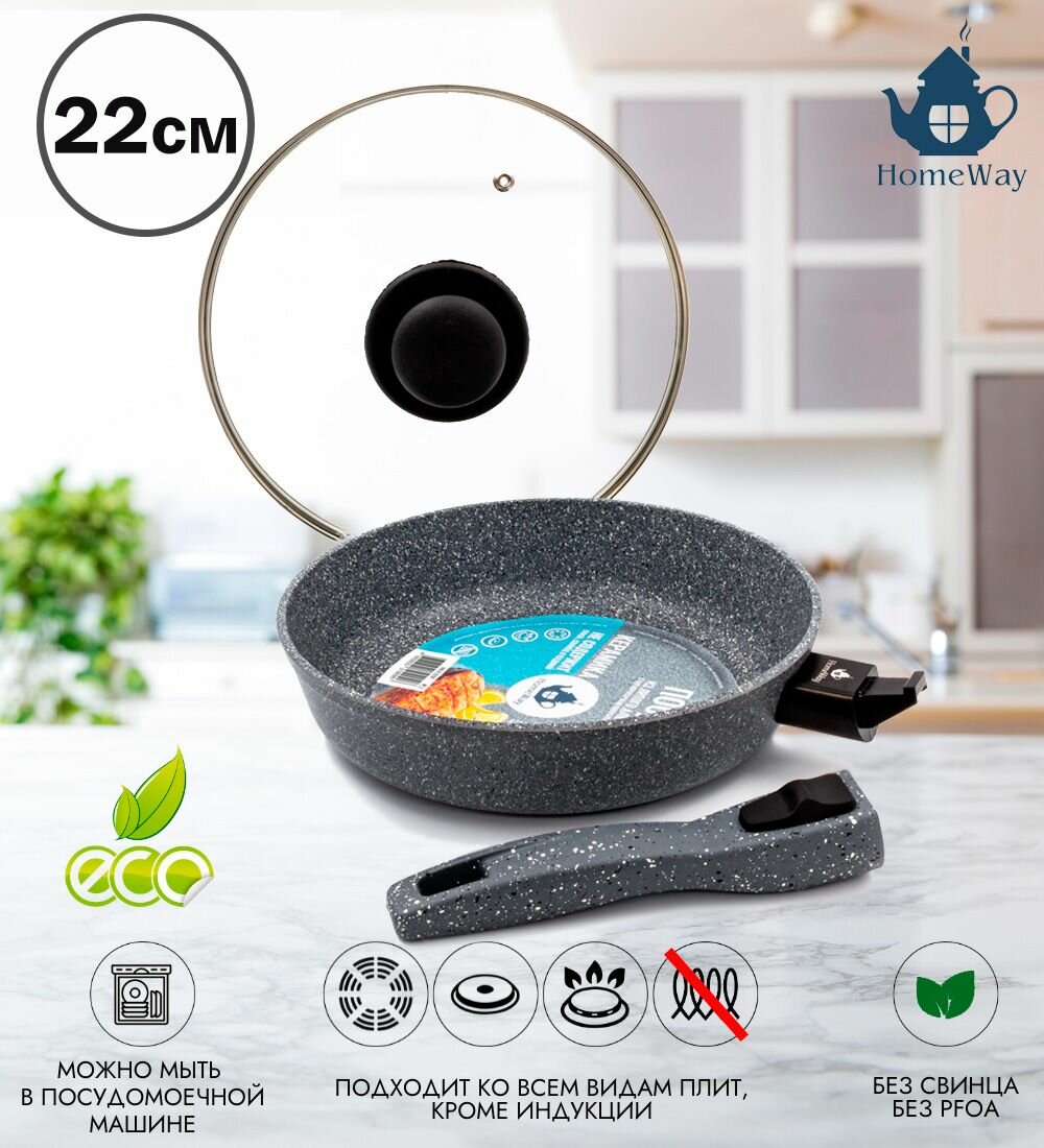 СохранитьСковорода литая с керамическим покрытием, с крышкой и съемной ручкой, 22см, HomeWay интересное: