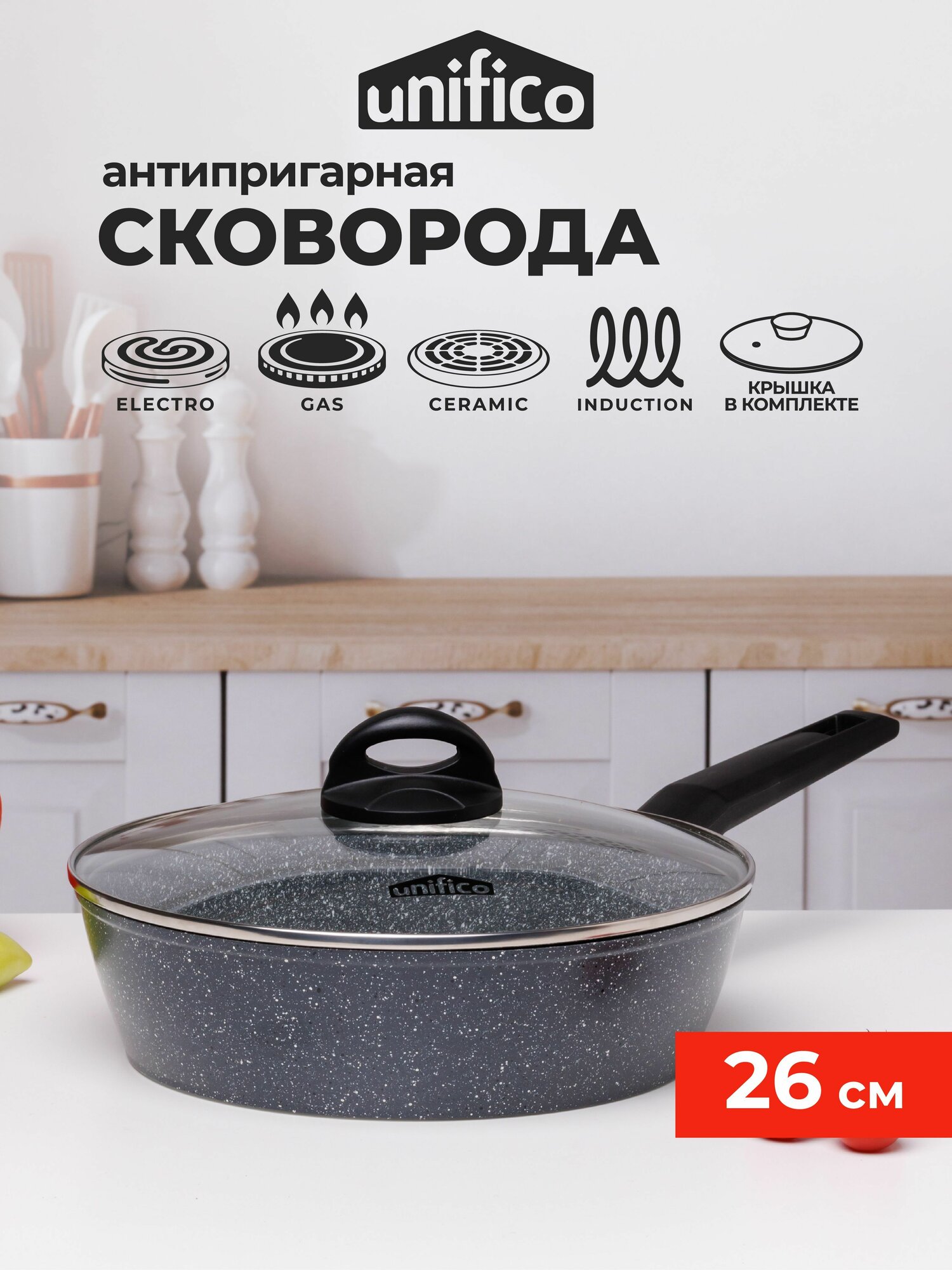 Сковорода с индукцией и крышкой 26 см глубокая UNIFICO Canone Grigio (широкое дно) интересное: