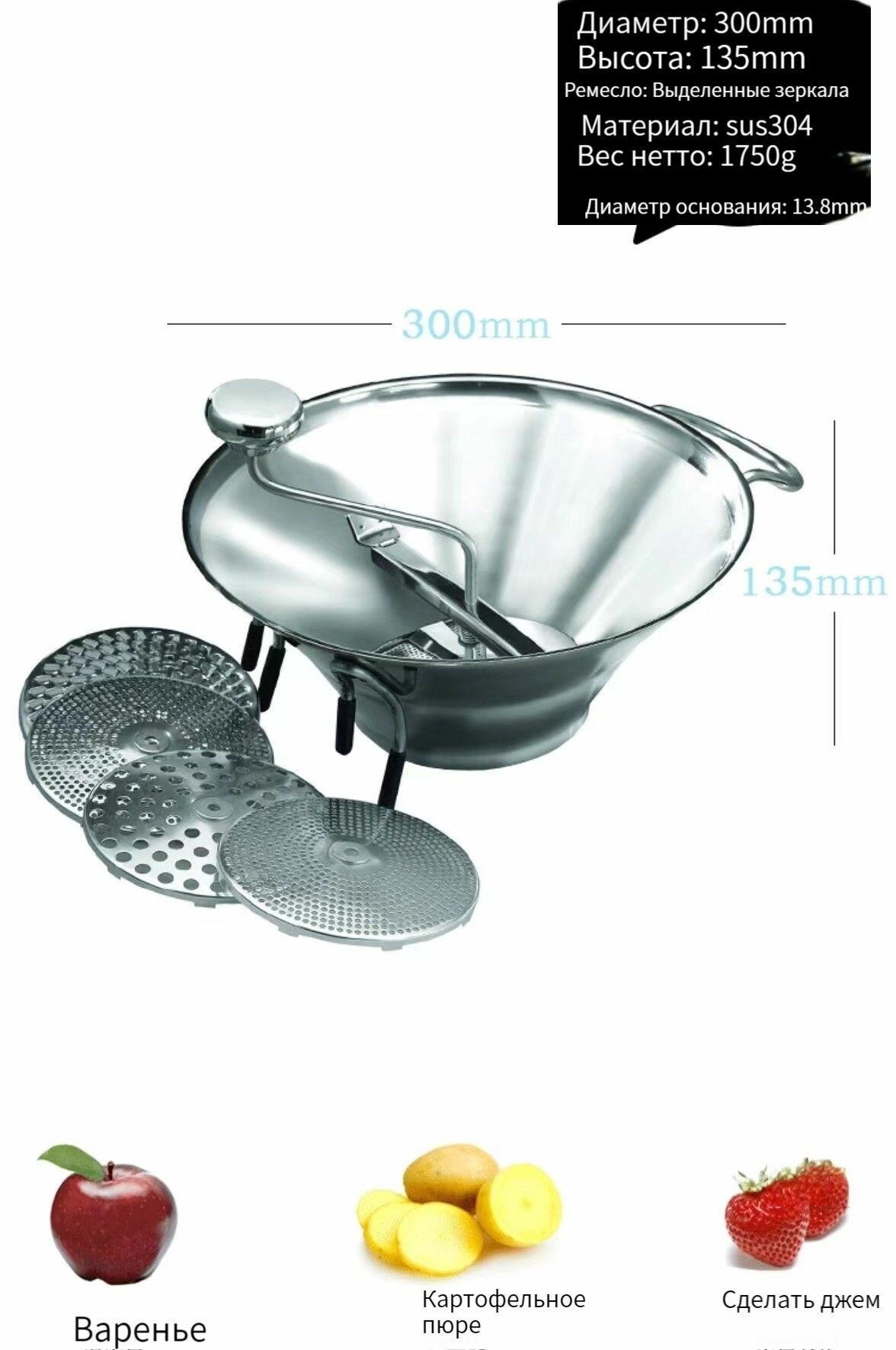 Пищевая мельница, Мельница для овощей , протирка овощей/фруктов/ягод, 3л, нержавеющая сталь интересное: