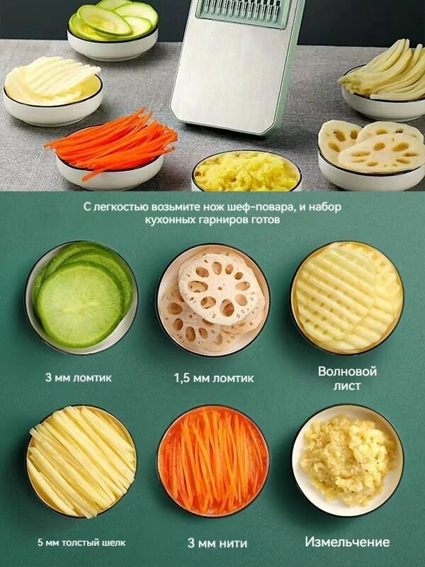 Терка, слайсер/измельчитель с 6 насадками-лезвиями для корейской моркови и других овощей. интересное: