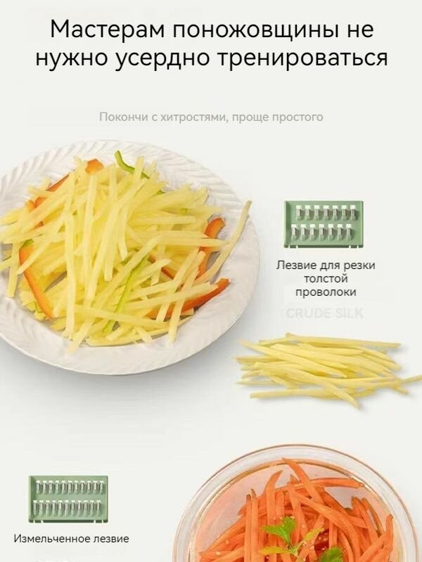 Купить Терка, слайсер/измельчитель с 6 насадками-лезвиями для корейской моркови и других овощей.