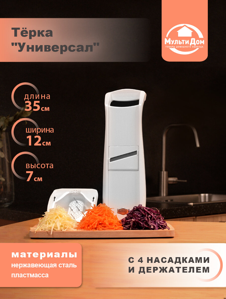 Терка Мультидом "Универсал", 4 насадки, с держателем, для овощей и фруктов, 35x12x7 см, белая интересное: