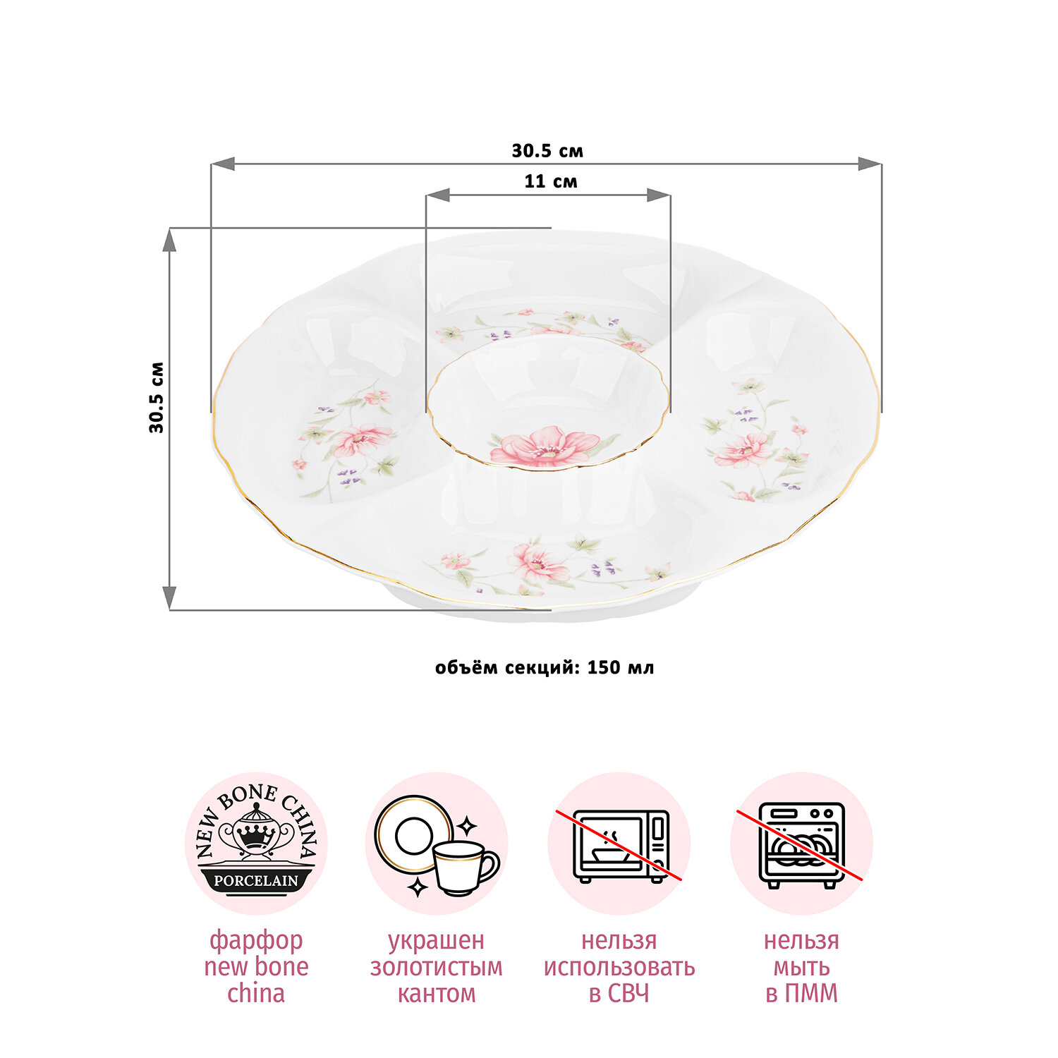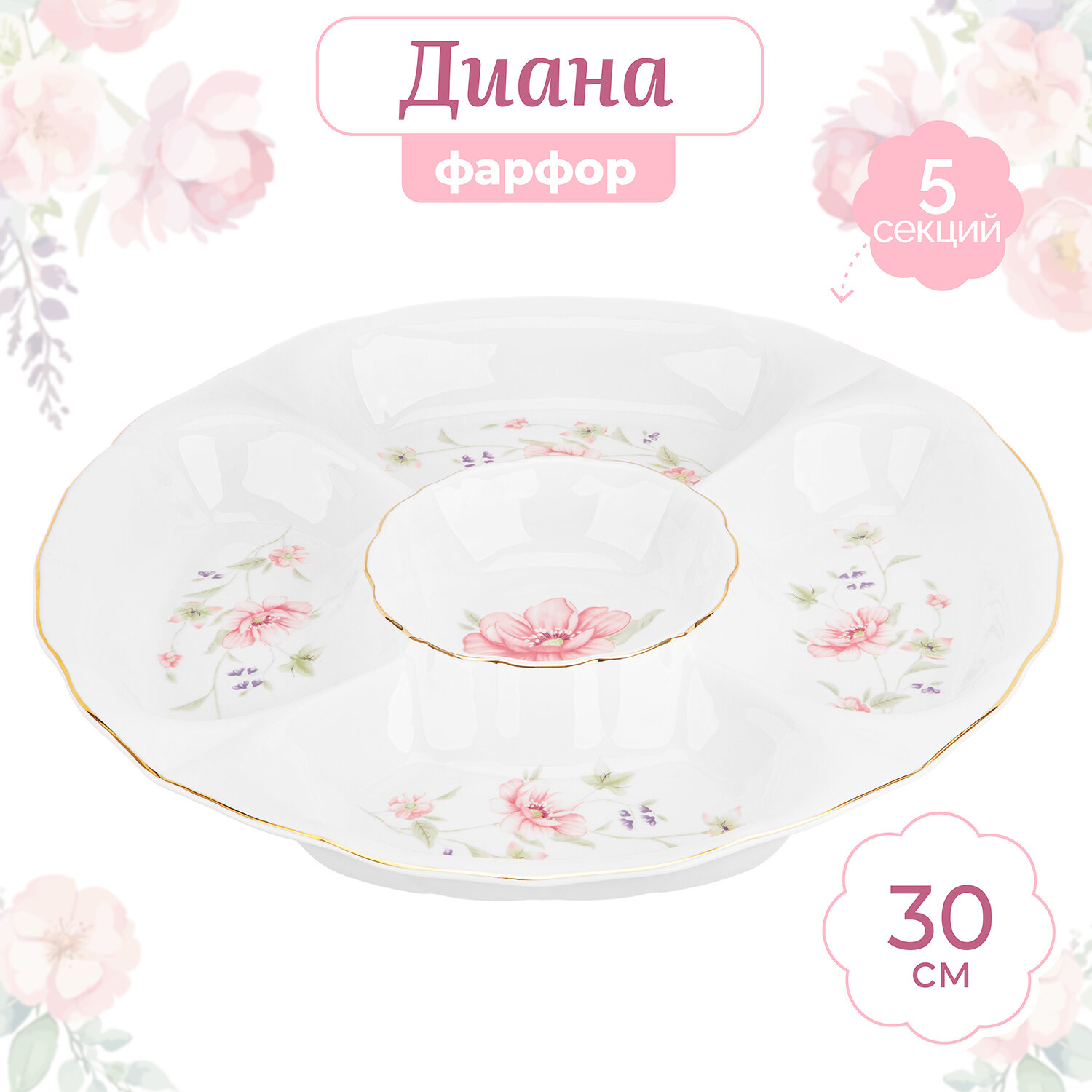 Блюдо-менажница 30,5х30,5х4 см Elan Gallery Диана, цельная, 5 секций интересное: