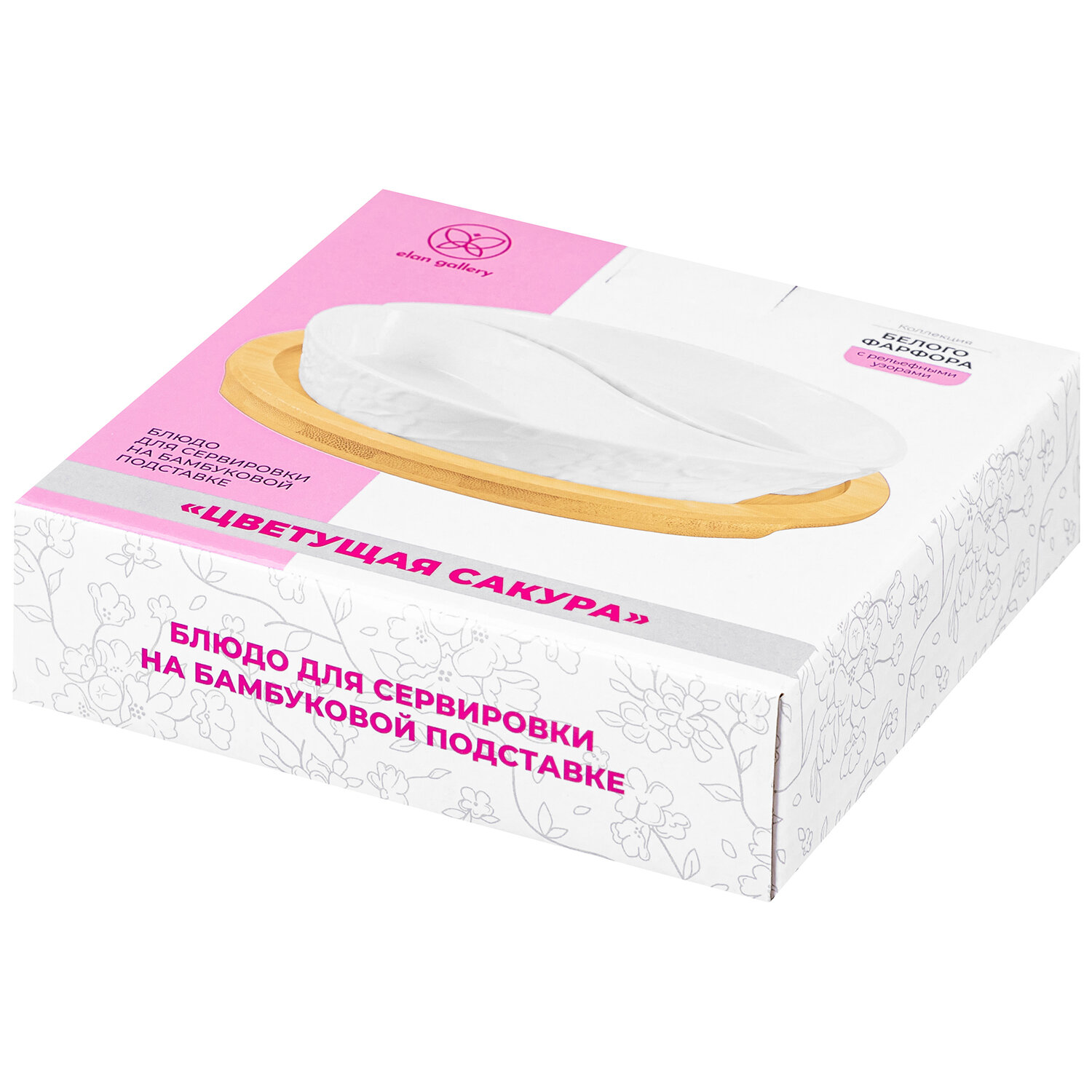 Тарелка, блюдо, менажница под оливки 100 мл Elan Gallery Инь-Янь цветущая сакура, 15,5х15,5х3,5 см, на дер. подставке интересное:
