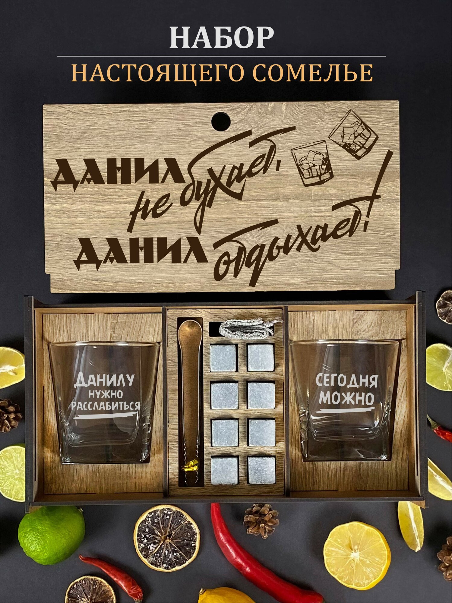 Купить Подарочный набор бокалы для виски и камни Данил отдыхает, Дане. Именной бокс в подарок мужчине на день рождения.