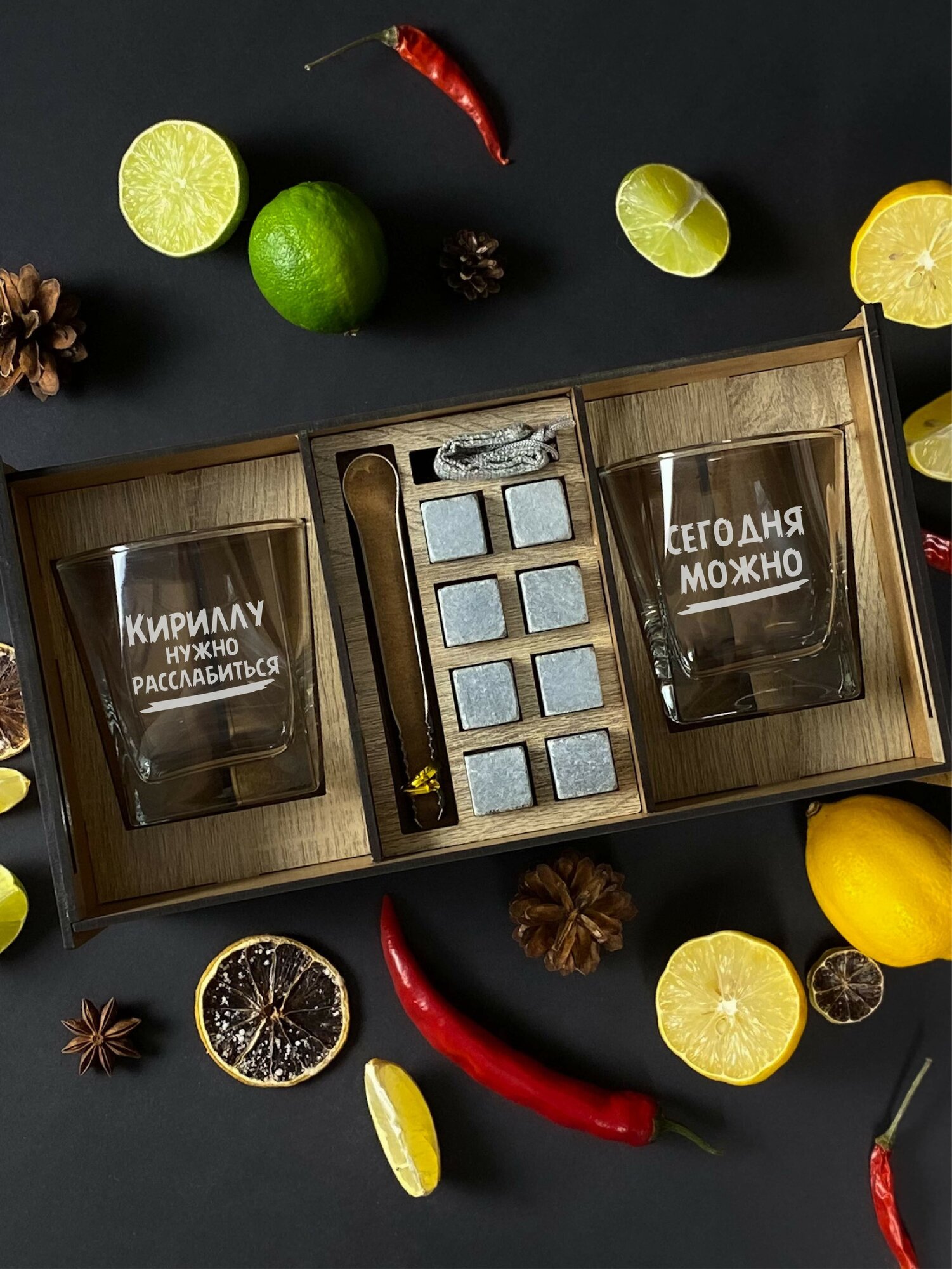 СохранитьПодарочный набор бокалы для виски и камни Кирилл отдыхает, Киру. Именной бокс в подарок мужчине на день рождения. интересное: