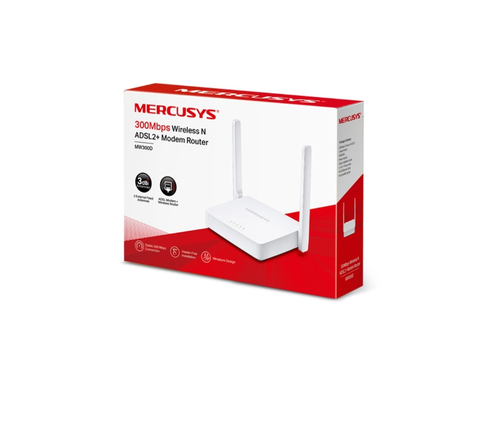 Mercusys MW300D Роутер ADSL2+, 2.4 ГГц, N300, входной интерфейс: 10/100BASE-TX/ADSL, 3 порта 10/100Base-TX, 2 внешние антенны