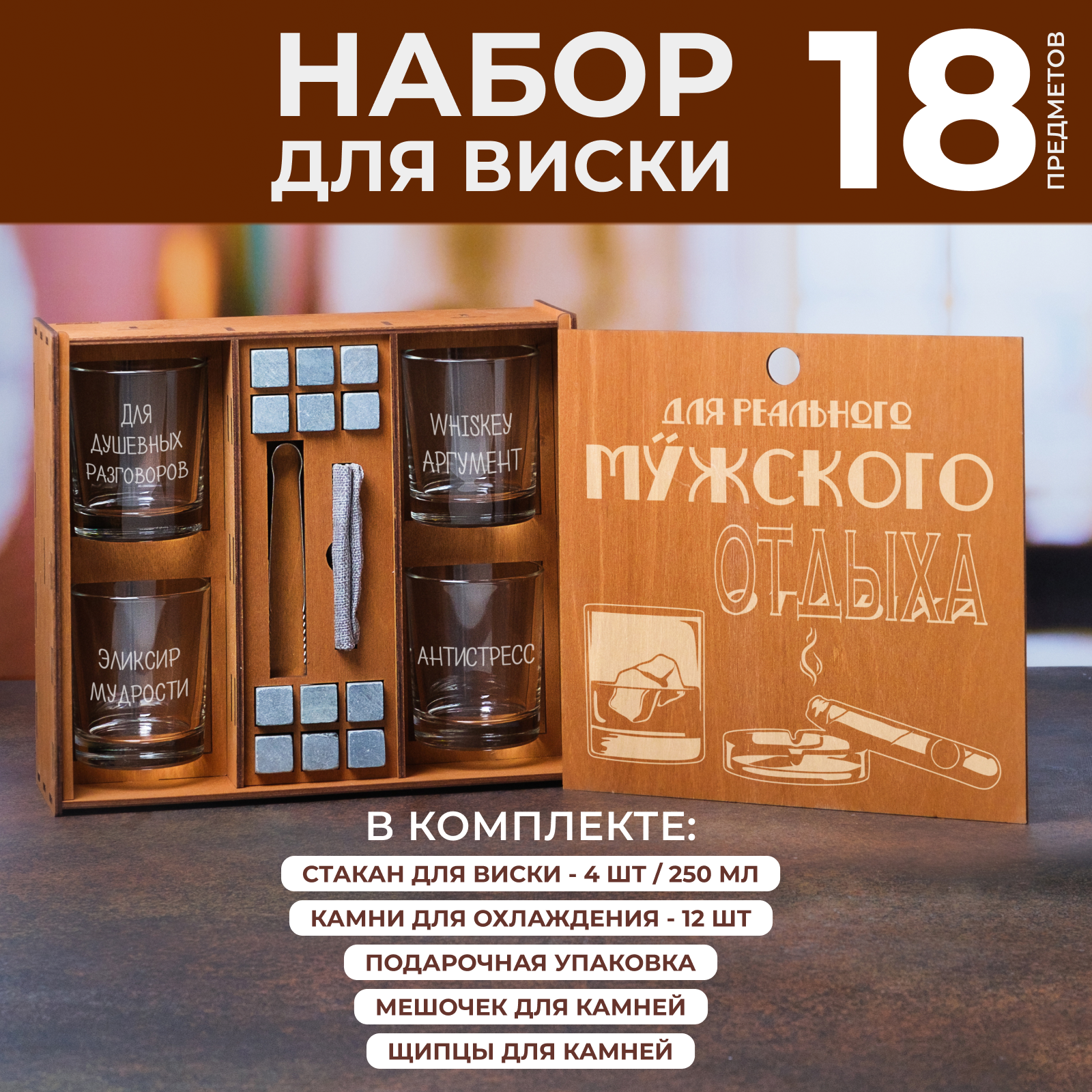 Подарочный набор "Для реального мужского отдыха" 4 квадратных стакана для виски 310 мл. с гравировкой в деревянной коробке. Подарок мужчине, мужу