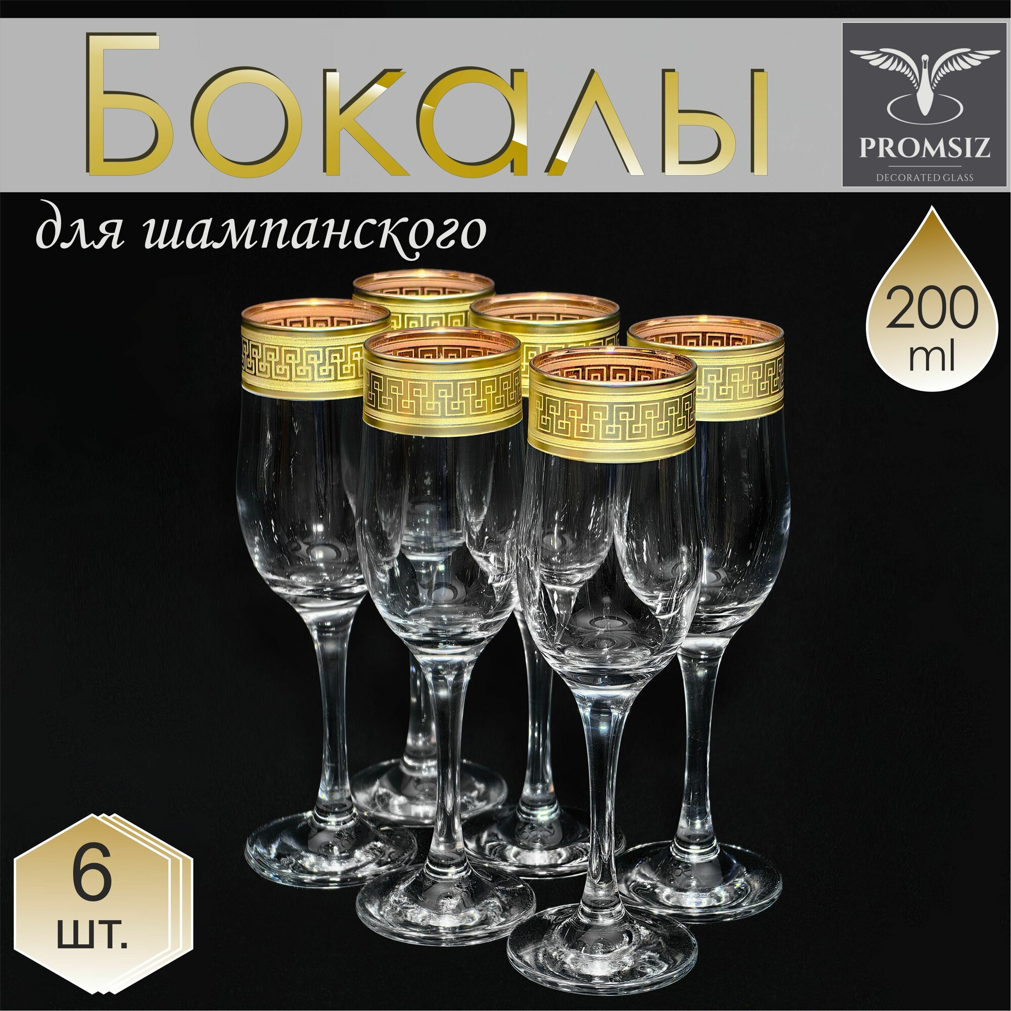 Подарочный набор бокалов для шампанского с алмазной гравировкой PROMSIZ Драйв 200 мл, 6 шт.
