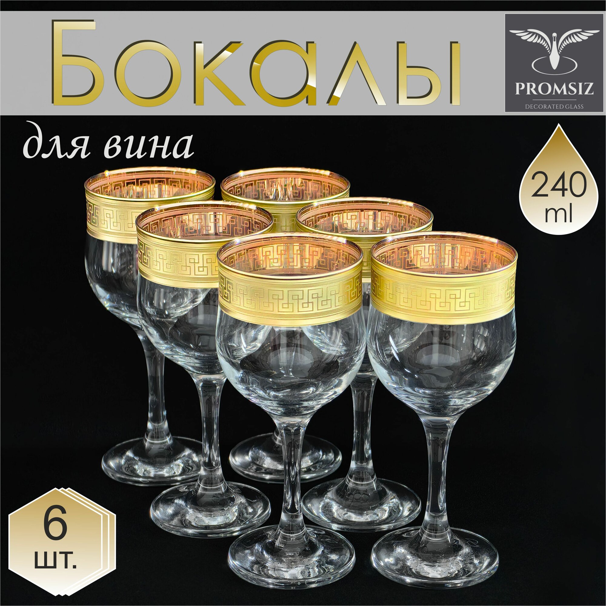 Подарочный набор стеклянных бокалов для вина с алмазной гравировкой PROMSIZ агора, 260 мл, 6 шт.