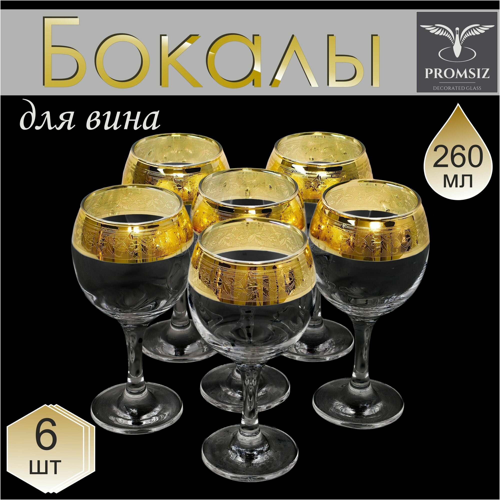 Подарочный набор стеклянных бокалов для вина с алмазной гравировкой PROMSIZ агора, 260 мл, 6 шт.