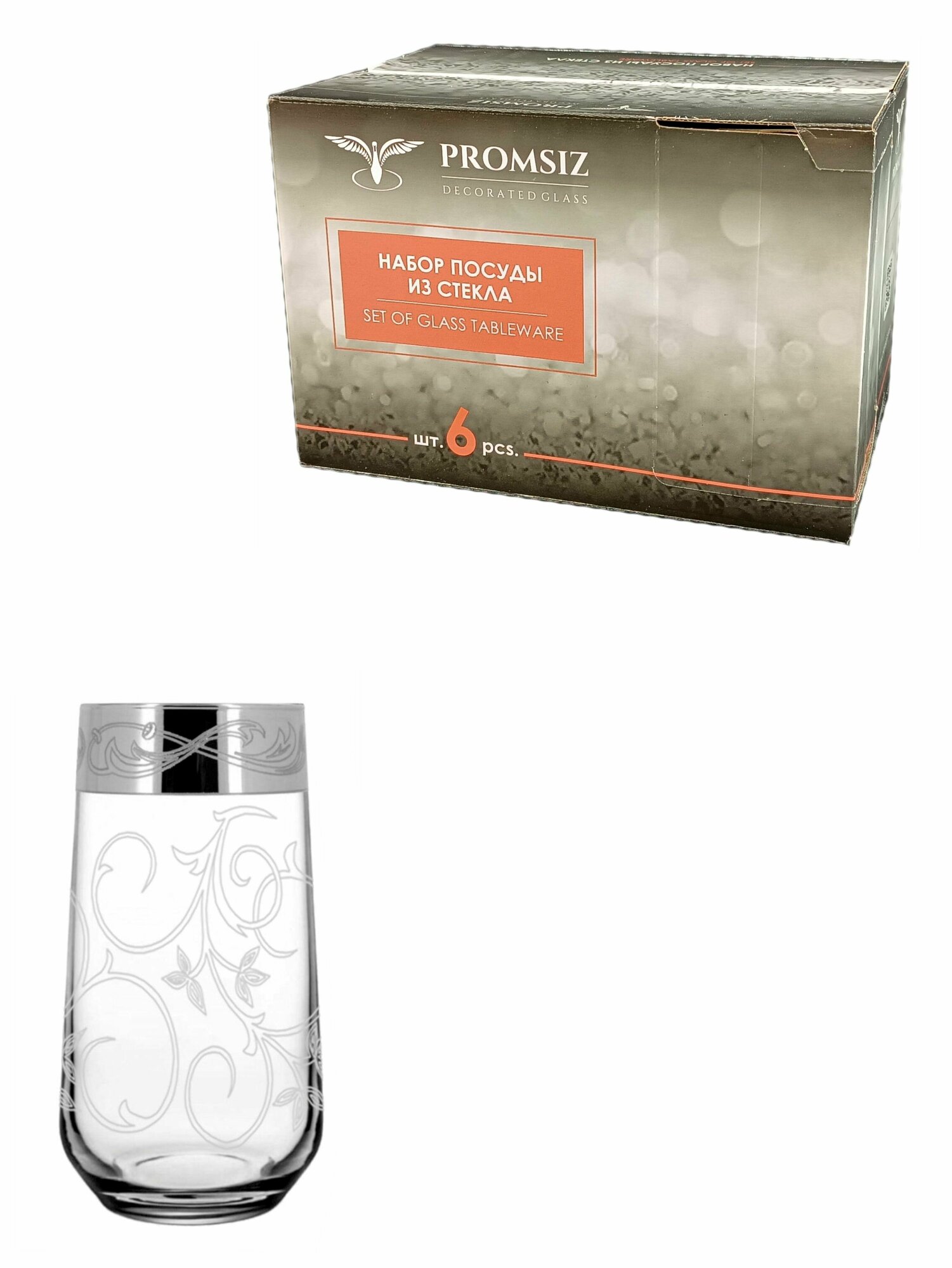 Набор высоких стаканов в подарочной упаковке с алмазной гравировкой для воды PROMSIZ барокко, 470 мл, 6 шт.