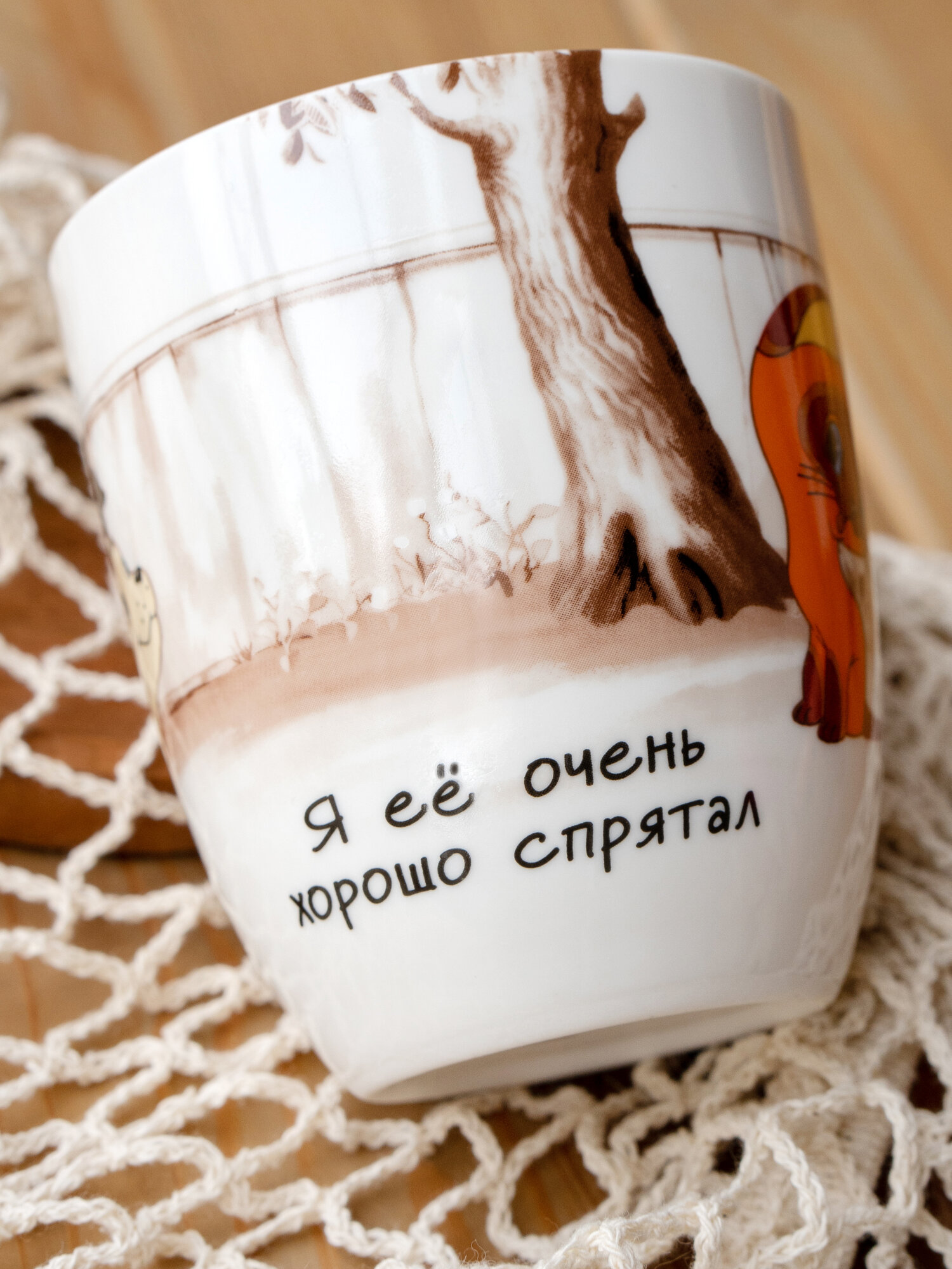 Кружка большая белая фарфор 420 мл. в подарочной упаковке. Бременские музыканты принт "Петь птицы перестали."