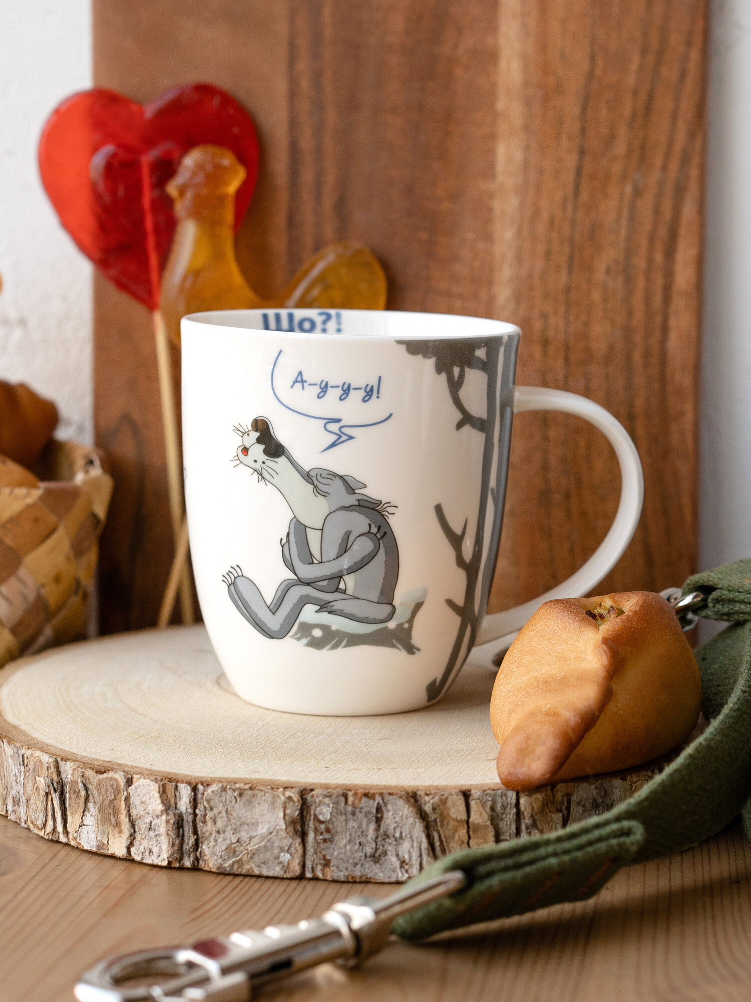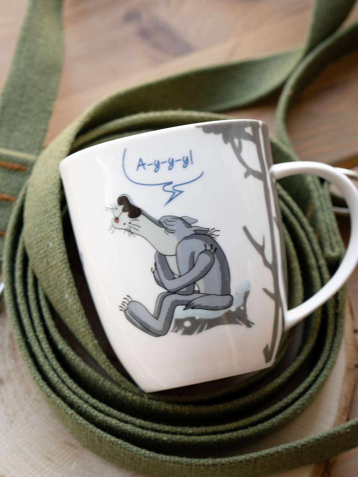 Кружка большая белая фарфор 420 мл. в подарочной упаковке. Бременские музыканты принт "Петь птицы перестали."