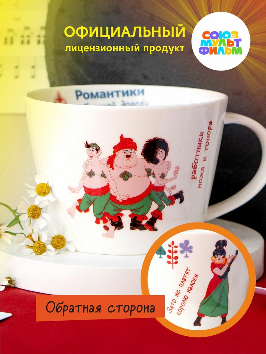 Кружка большая белая фарфор 420 мл. в подарочной упаковке. Бременские музыканты принт "Петь птицы перестали."