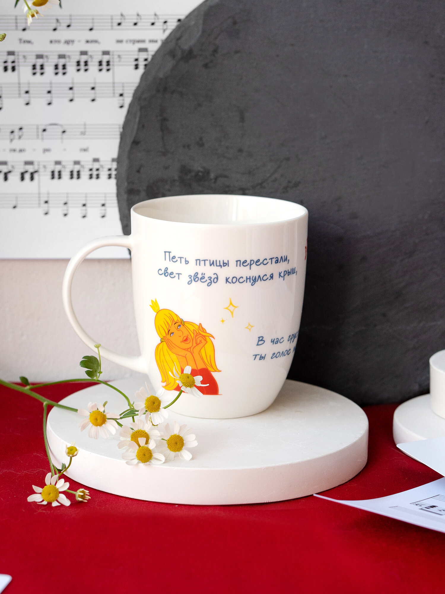 Купить Кружка большая белая фарфор 420 мл. в подарочной упаковке. Бременские музыканты принт "Петь птицы перестали."