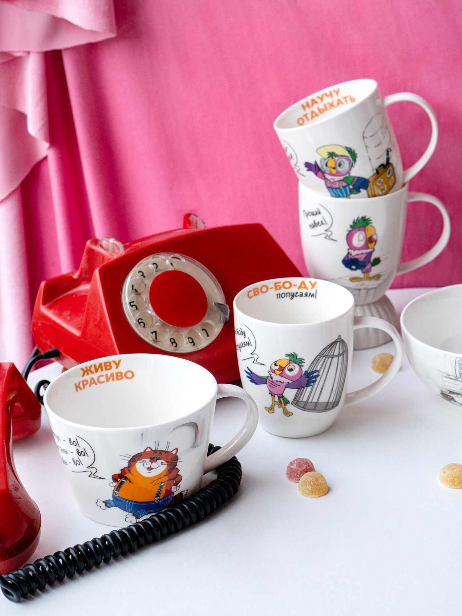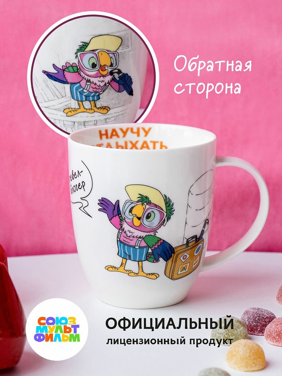 Кружка большая белая фарфор 500 мл. "Попугай Кеша" в подарочной упаковке. Коралл